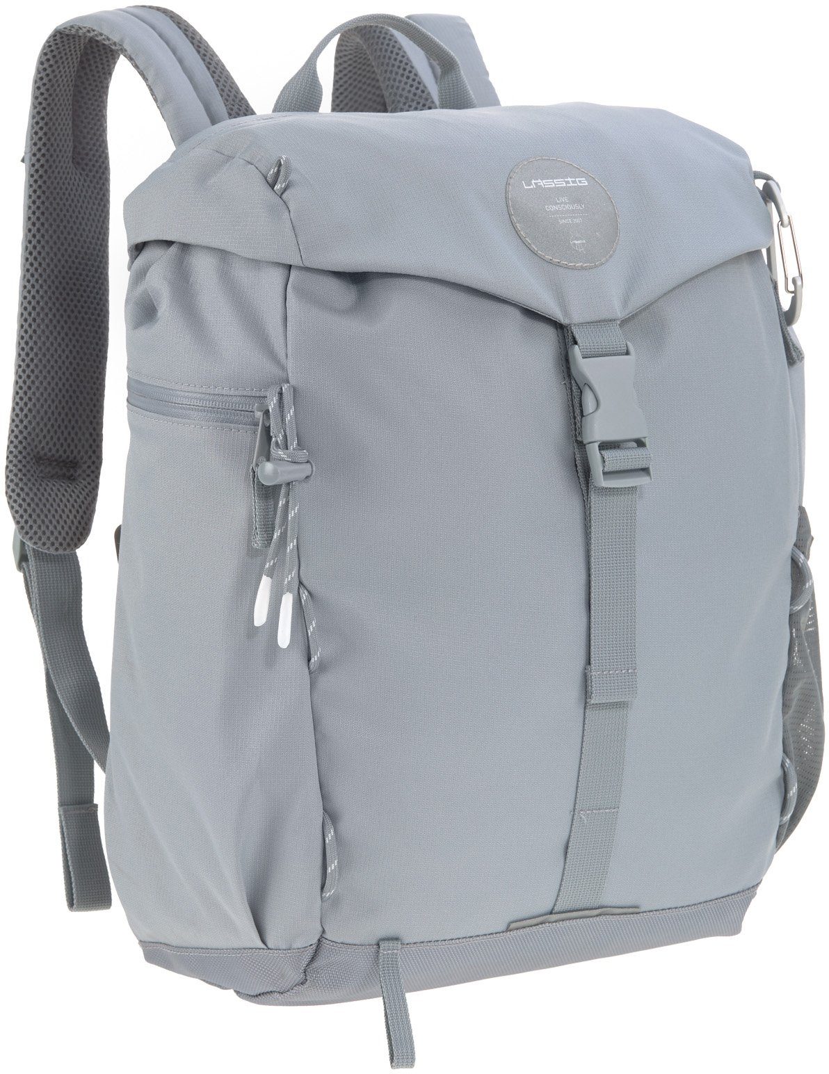 Der Wickelrucksack »Green Label, Outdoor, grey« von Lässig ist der perfekte Mix aus Wickeltasche und Outdoorrucksack. Mit dem schlichten Backpack steht dem nächsten Ausflug ins Grüne nichts mehr im Weg. Auch im Alltag ist der Wickelrucksack ein toller Begleiter mit umfangreichem Zubehör. Sein durchdachtes Design und seine Funktionalität machen ihn zum absoluten Must-have für aktive Familien. Die gepolsterte Rückenpartie sorgt dank Lüftungskanälen und Mesh-Stoff für eine gute Luftzirkulation. Noch mehr Komfort bieten der höhenverstellbare Brustgurt und die verstellbaren, ergonomisch geformten und gepolsterten Schulterriemen. Mit seinem integrierten Regenschutz in Neon-Orange und der verstellbaren Jackenhalterung und einem Karabiner macht er sogar die wildesten Abenteuer bei Wind und Wetter mit. Reflektierende Elemente, wie das Lässig Logo, sorgen für Sichtbarkeit bei Dunkelheit. Das Außenmaterial ist robust und zusätzlich wasserabweisend, der verstärkte Boden sorgt dafür, dass man lange Freude hat. Ein gut durchdachtes Innenleben, Staufächer innen und außen sowie das umfangreiche Wickelzubehör runden den Rucksack ab. Ausgestattet mit einer wasserabweisenden Wickelunterlage, einem isolierten Flaschenhalter, einer herausnehmbaren Gläschenhalterung, einer Kinderwagenbefestigung und einer kleinen Utensilientasche hat man alles, was man unterwegs braucht. Zusätzlicher Pluspunkt: Das Innenleben ist zu 100 % aus recyceltem Polyester der Textilmarke Waste2Wear hergestellt. Hierfür wurden 10 wiederaufbereitete PET-Flaschen verarbeitet. Der Wickelrucksack »Green Label, Outdoor, grey« ist somit die optimale Wahl sowohl für Ausflüge in die Natur als auch für den Alltag! Die Lieferung erfolgt ohne Inhalt.