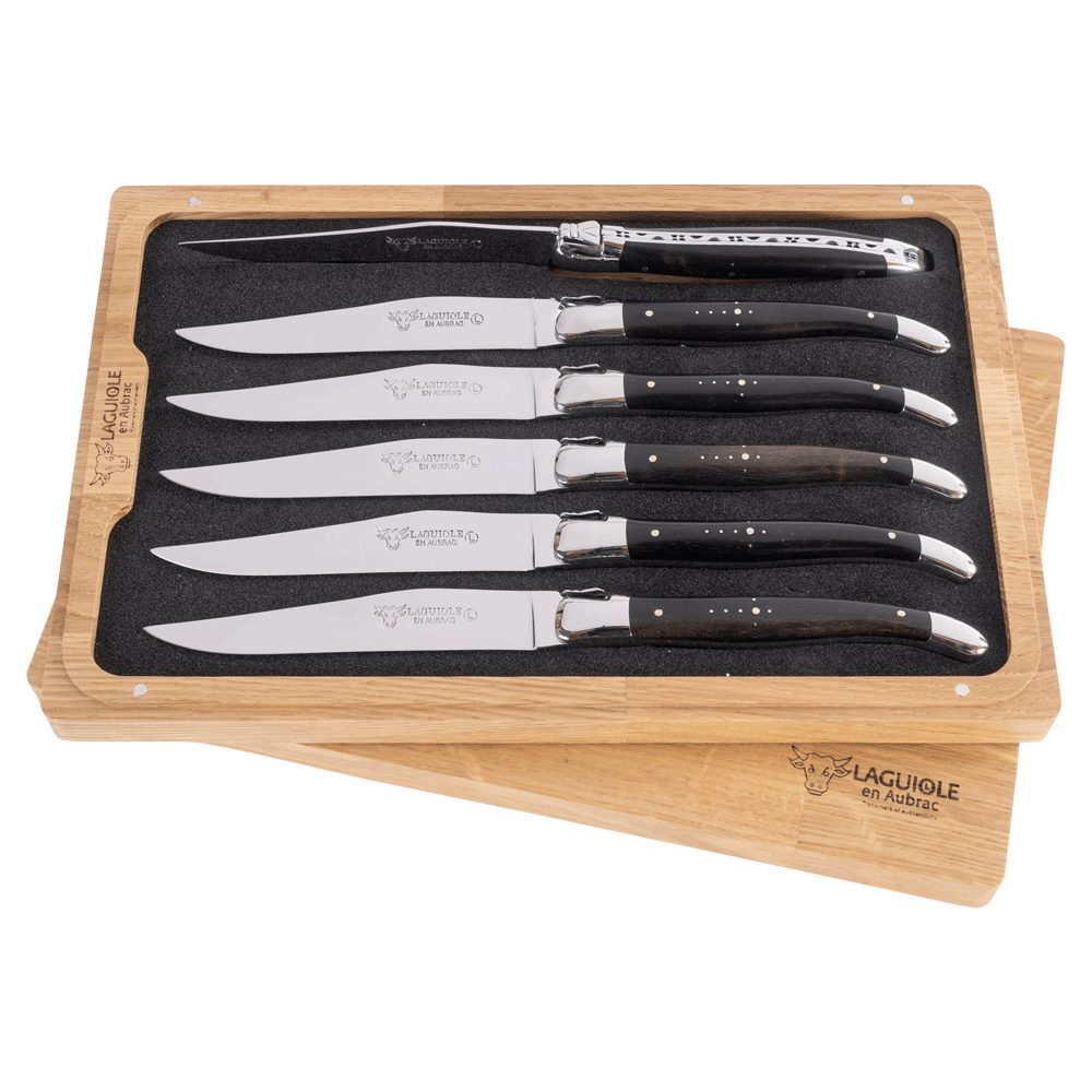 Lieferumfang: 6 Laguiole en Aubrac Steakmesser Ebenholz, Herstellerzertifikat, Schatulle aus Eichenholz mit Logo der Schmiede, Laguiole-Ratgeber