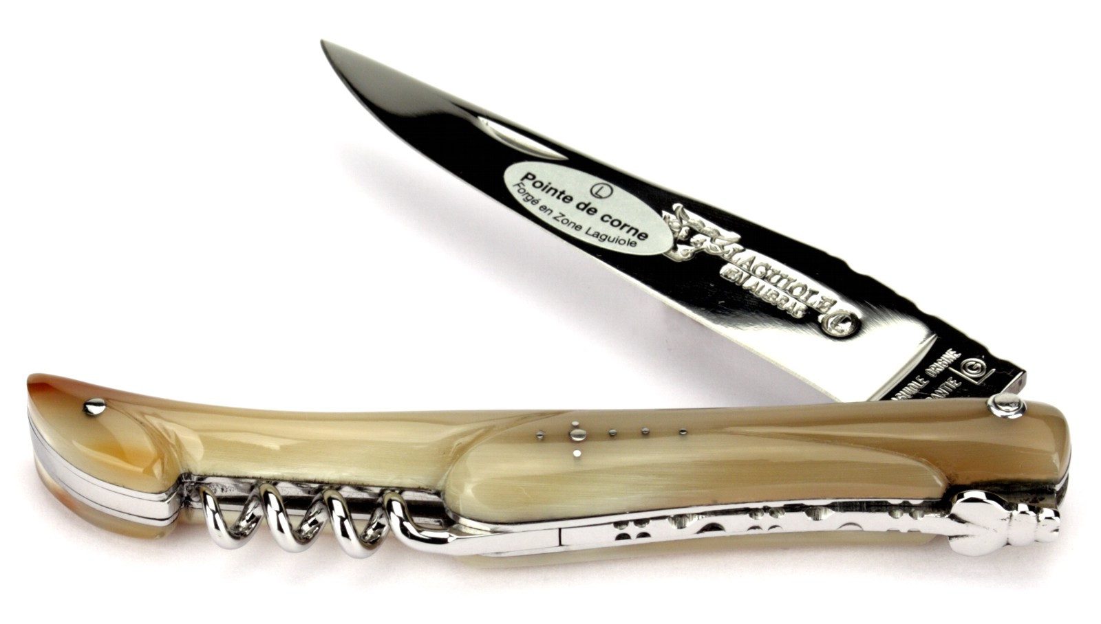 Das Messer hat eine 10 cm lange Klinge aus hochglänzendem 12C27 Sandvik-Stahl, die mit dem bekannten Stierkopf-Logo und dem "L" als Merkmal für die Herkunft aus der Ursprungsregion Laguiole versehen ist.