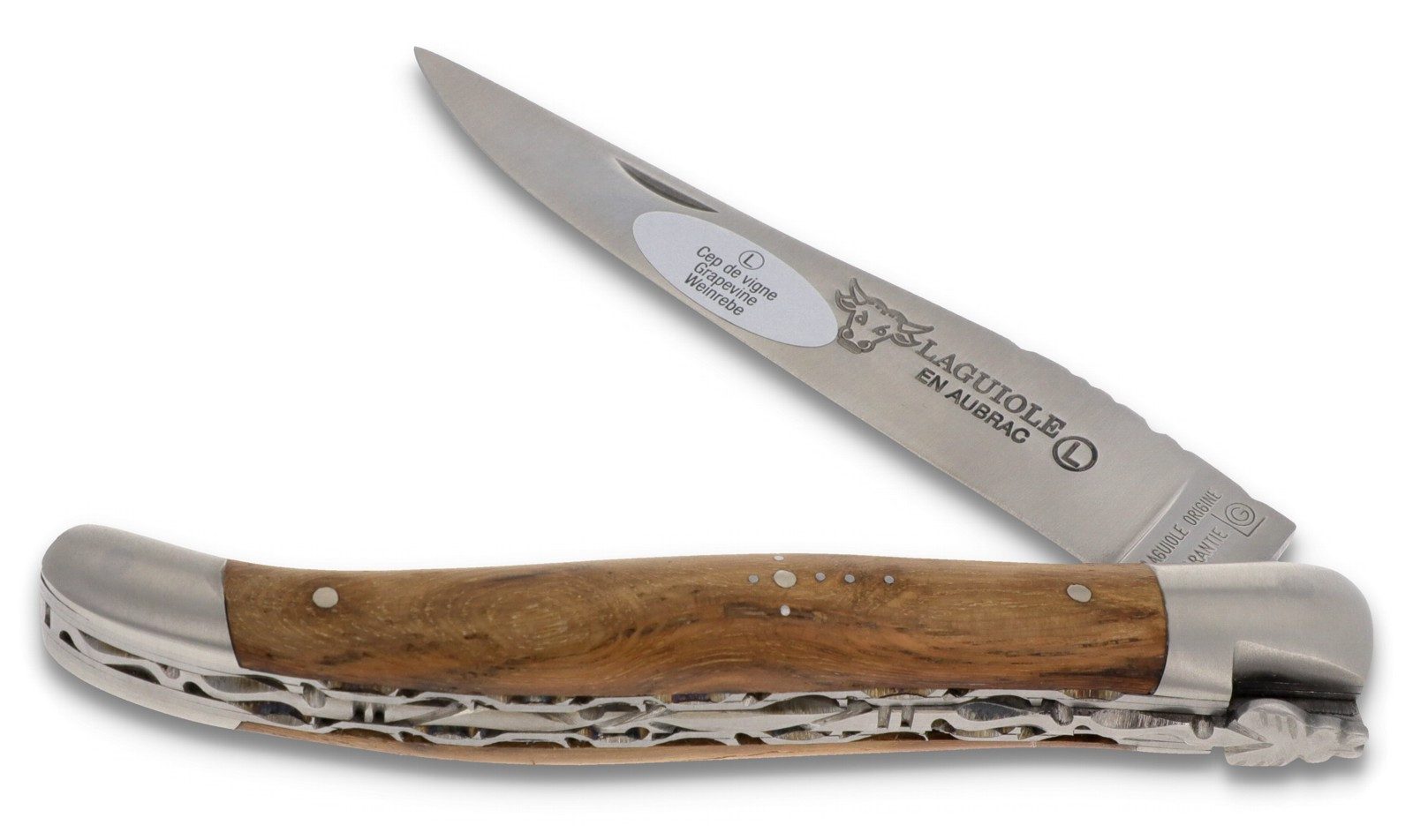 Schön und präzise fassen die matten Edelstahlbacken und die auffällige Doppelplatine die beiden Griffschalen aus alter Weinrebe ein. Das Holz ist fein gemasert und verströmt einen leicht pfeffrigen Geruch.