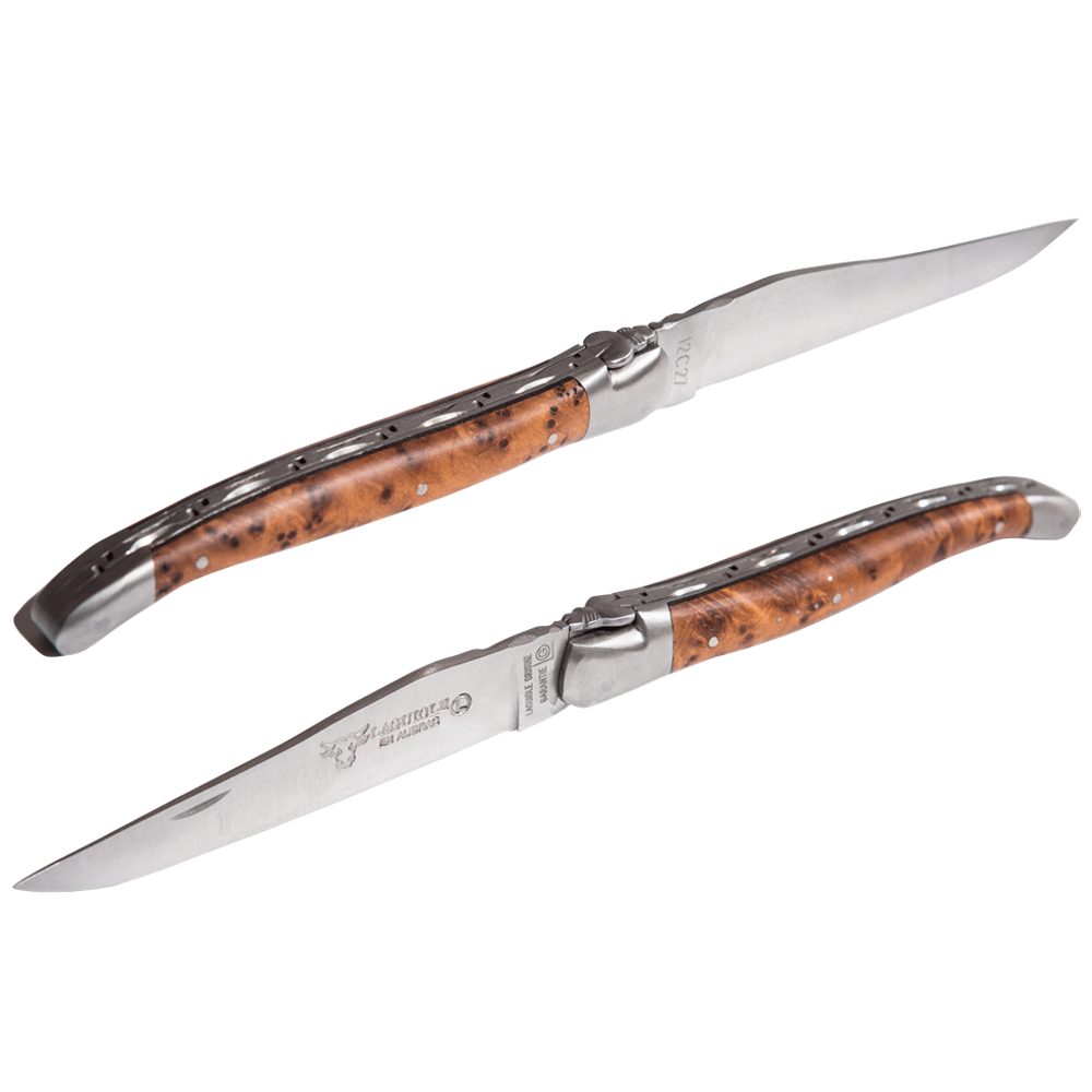 Thujaholz ist ein selten verwendetes Holz, obwohl es von Schreinern wegen den kleinen schwarzen Ästchen sehr geschätzt ist. Thujaholz zählt zu den edelsten Wurzelhölzern überhaupt. Die Griffschalen dieses Taschenmessers bewegen sich farblich von mittel- bis schokobrauner Farbe. Darüber hinaus ist das Maserholz mit feinen Augen und Ästchen strukturiert. Aus feinen Metallnieten ist das sogenannte Hirtenkreuz auf der linken Seite des Griffs eingearbeitet. Dieses Symbol ist ein Zeugnis aus vergangenen Zeiten. So wird sich erzählt, dass das eingearbeitete Kreuz den Hirten dazu diente, vor einem Kreuz beten zu können, in dem das Besser senkrecht in den Bodengesteckt wurde. Einer Legende nach muss das Hirtenkreuz auf einem Laguiole en Aubrac Taschenmesser aus sieben Nieten (oder Stiften, Nägelchen) bestehen, da sie die einzelnen Wochentage symbolisieren sollen. Auch Hexen und Geister sollten mit dem Kreuz ferngehalten werden.