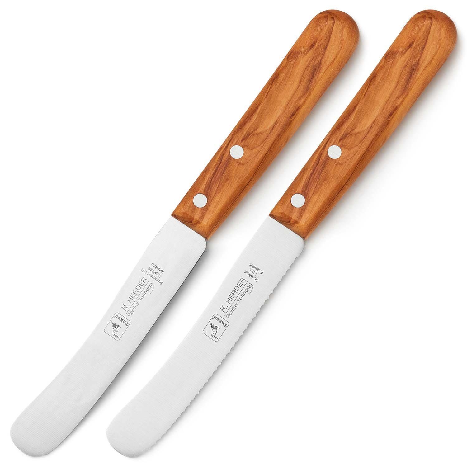 EL. Herder KG seit 1928 ein Traditionsunternehmen aus der Klingenstadt Solingen Unsere Buckelsmesser sind von höchster Qualität und eignen sich perfekt für die Benutzung am Frühstückstisch, z.B. um Butter, Marmelade und Co. auf dem Brot zu verschmieren. Aufgrund der Klingenstärke verbiegt sich die Klinge beim schmieren nicht. Das Buckelsmesser ist ein altdeutsches Frühstücksmesser und wir in seiner Form seit über 100 Jahren nahezu unverändert in Solingen produziert. Die Klinge wird feingeschliffen und sucht hierdurch in Sachen Schneidqualität und Erhalt der Schnittfähigkeit ihresgleichen. Ein zeitloser Klassiker und eine mediterrane Schönheit... Olivenholz, robust, stilvoll, kommt niemals aus der Mode und erfüllt hohe Ansprüche an Optik und Qualität. Wer sich für Olivenholz entscheidet, liebt nicht nur die warmen Farben und die eindrucksvollen Maserungen, sondern schätzt die positiven Eigenschaften sehr. Olivenholz hat eine natürliche antibakterielle Oberfläche, eine hohe Dichte und Härte und ist dadurch sehr langlebig. Diese Produkte sind aus reinstem Olivenholz gefertigt. Sie erhalten ein ganz idividuelles Unikat, naturbedingt kann die Maserung und Form von der Abbildung abweichen. Jedes Holz „arbeitet“ und reagiert auf verschiedene Temperaturen und auf Luftfeuchtigkeit, so kann es auch noch nach längerer Zeit zu materialbedingten Farbunterschieden oder kleinen Haarrissen kommen. Dies sind typischen Erscheinungen und nicht auszuschließen, da es sich um ein Naturmaterial handelt und stellt daher keinen Reklamationsgrund dar. Beacheten Sie bitte unsere Pflegehinweise, damit Sie sehr lange Freude an diesen Olivenholz-Produkten haben. -auf keinen Fall in die Spülmaschine -immer von Hand mit etwas Spülmittel und lauwarmen Wasser mit einem Tuch oder weichem Schwamm reinigen, wichtig! heißes Wasser kann Olivenholz zerreißen -immer sofort mit einem Küchentuch trocken wischen Herstellerangaben: Gesamtlänge: 22 cm Длина Griff: 10,5 cm Длина Klinge: 11,5 cm Stärke Klingerücken: ca. 1,4 mm Griffmaterial: Olivenholz Material Klinge: Edelstahl (Spezialstahl 1.4116) Klinge ohne Wellenschliff: Handabzug Klinge mit Wellenschliff: extra scharfer Wellenschliff Einzelgewicht ca.: 50 g Herkunft: Made in Solingen (Germany) Pflegehinweise Wir sind überzeugt von der Qualität der Produkte. Die Firma El Herder KG aus Solingen verwendet für Ihre Produkte in der Применитьung nur hochwertige Materialien und hat ausgefeilte Produktionsprozesse. Die Langlebigkeit der Produkte hängt insbesondere aber auch von der korrekten Handhabung und Pflege ab, weshalb wir unseren Kunden an dieser Stelle einige Hinweise zum richtigen Gebrauch und zur Pflege unserer Produkte geben wollen. Wir empfehlen grundsätzlich unsere Schneidwaren nicht in der Spülmaschine zu reinigen, um einen vorzeitigen Verschleiß (u.a. durch Ablagerung von Fremdkörpern und Beschädigung der Klinge) durch die verwendeten Reinigungsmittel zu verhindern. Stattdessen empfehlen wir die Reinigung von Hand unter lauwarmem Wasser und bei Verwendung eines milden Spülmittels. Ein haushaltsübliches Spültuch oder ein weicher Schwamm eignen sich besonders, um hartnäckigere Essensrückstände zu entfernen. Im Anschluss an die Reinigung sollte die Schneidware sofort abgetrocknet werden – auch hier reicht ein haushaltsübliches Trockentuch aus. Insbesondere die Pflege der Schneidwaren mit Holzgriffen möchten wir Ihnen besonders ans Herz legen. Hierbei ist darauf zu achten, dass die Messergriffe nicht mit Wasser in Kontakt kommen, um eine Austrocknung des Holzes zu verhindern. Da es sich bei den von uns verwendeten Hölzern um europäische Holzarten handelt, welche nicht wasserresistent sind, sollten Sie beim Waschen des Messers darauf achten, die Klingen sofort zu trocknen, damit keine Feuchtigkeit auf den Holzgriff übergehen kann. Durch regelmäßiges Einölen mit Öl (z.B. mit Leinöl oder anderen Holzpflegeölen) oder Wachs (z.B. mit Bienenwachs) können Sie den Schutz des Holzes vor Ausbleichung erhöhen und einen langlebigen Glanz und satte Farben des Messergriffs sicherstellen. Unsere Messer aus Carbon- und Gußstahl sind nicht rostfrei und sollten daher besonders gepflegt werden. Die Klingen dieser Messer verfügen über eine leichte Schutzschicht aus Öl und Wachs, welche für einen gewissen Zeitraum vor Verfärbung schützt. Sobald diese Schutzschicht verbraucht ist, beginnen sich Messer aus Carbon- oder Gußstahl durch Kontakt mit Feuchtigkeit bläulich/schwarz zu verfärben. Mit einer geeigneten Scheuermilch und einem groben Schwamm kann die Klinge dann aber wieder aufgehellt werden. Unsere Messer aus Edelstahl sind korrosionsbeständig und verfügen ebenfalls über eine feine Schutzschicht. Zum Erhalt der Schutzschicht ist eine regelmäßige Reinigung und pflege der Klinge unerlässlich, dann haben auch Flug- und Fremdrost keine Chance. Durch den regelmäßigen Gebrauch unserer Messer nutzt sich die Klinge gleichmäßig ab und wird dünner – die Schneidfähigkeit bleibt jedoch erhalten. Je nach Messer- und Klingenart ist es möglich, dass die Klinge im Laufe der Nutzung abstumpft. Sie können die Klingen unter Nutzung eines Wetzstahls oder eines Wetzsteins (Blockstein) dann problemlos nachschärfen. Beachten Sie, dass Sie beim Schärfen der Klinge einen Winkel von ca. 15-20 Grad einhalten und die gesamte Scheide vom Ansatz des Griffs bis zur Spitze der Klinge am Wetzstahl entlangführen. Für den Schärfungsprozess spielt die Geschwindigkeit der Bewegung keine Rolle. Bei Beachtung der obigen Pflege- und Gebrauchshinweise haben Sie lange Freude an den Messern der Firma El Herder KG aus Solingen.