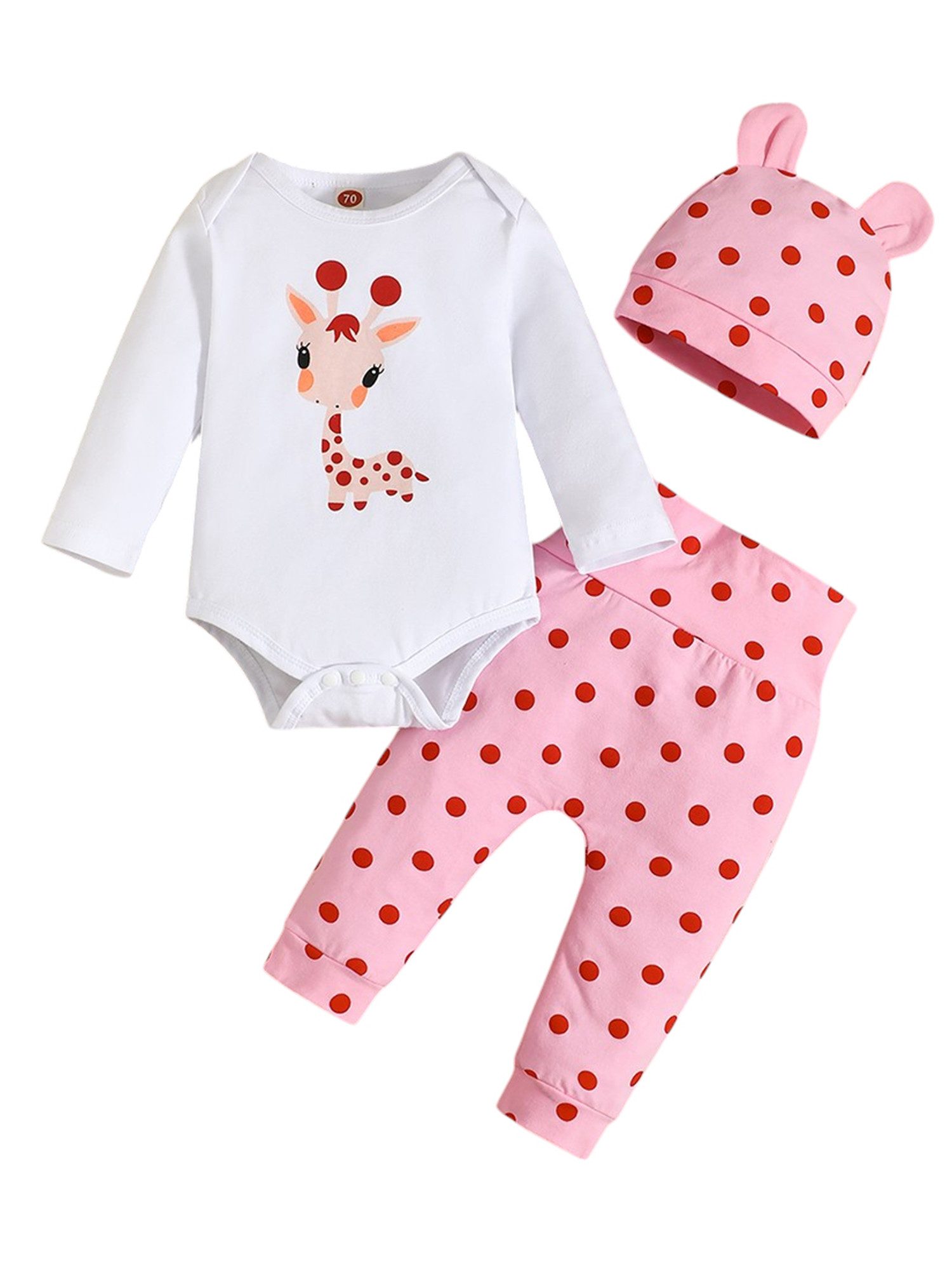 Der niedliche Giraffendruck ist einer der beliebtesten Tierdrucke für Babys. Er wird mit einer rosa Hose mit roten Punkten kombiniert. Der Gesamteffekt ist sehr süß und verspielt. Beim Anziehen fühlen sich Babys entspannt und wohl, da es aus weichem und hautfreundlichem Baumwollmaterial besteht.