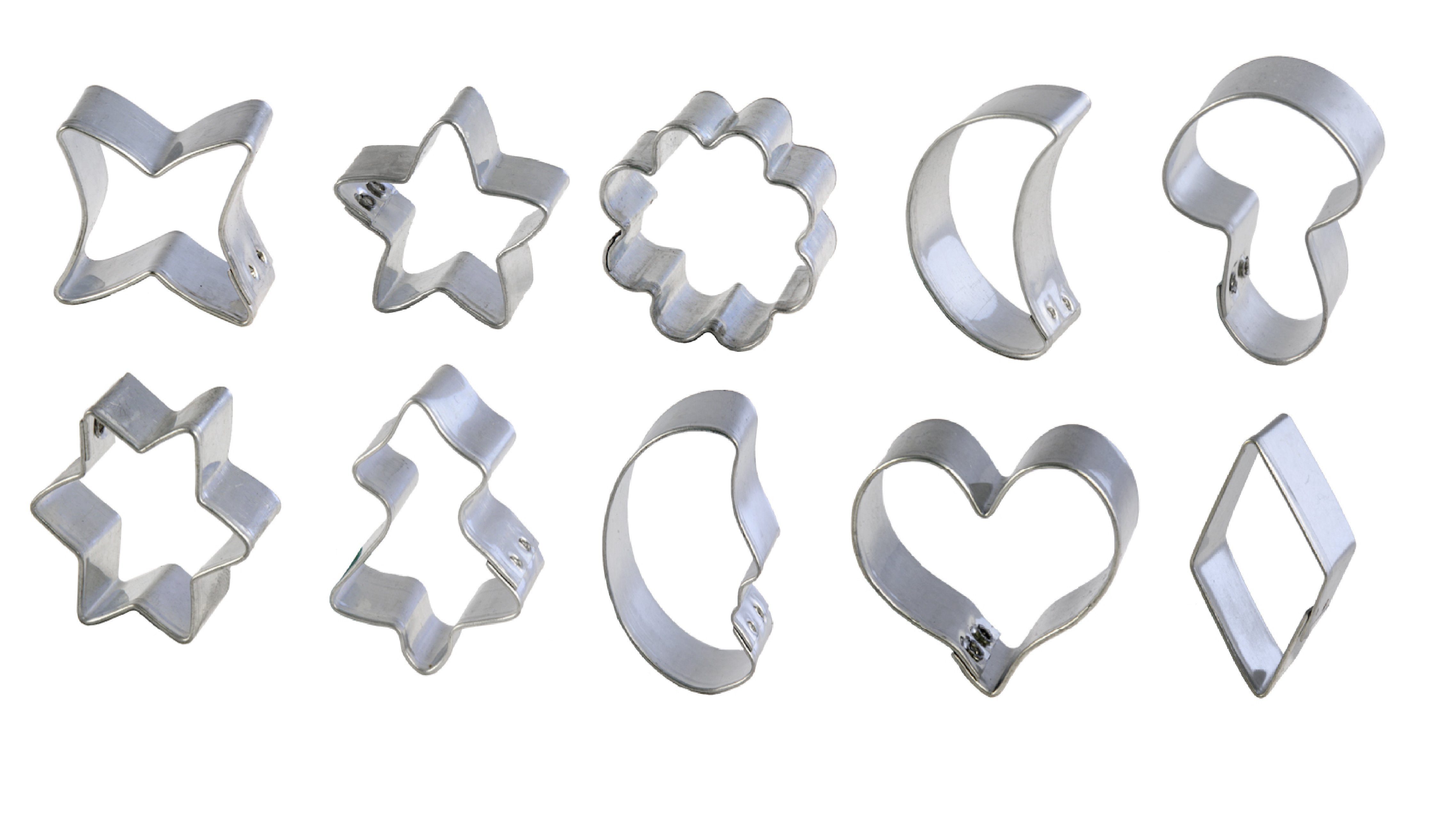 Ausstecher Mini: Schmetterling: Ø ca. 3 cm, Stern: Ø ca. 3,5 cm, Herz: Ø ca. 3,5 cm, Sichel: Ø ca. 4,5 cm, Pilz: Ø ca. 4 cm, Tanne: Ø ca. 4 cm, Mond: Ø ca. 4 cm, Stern 6 Zacken: Ø ca. 4 cm, Raute: Ø ca. 4,5 cm, Rund mit großer Welle: Ø ca. 3,5 cm