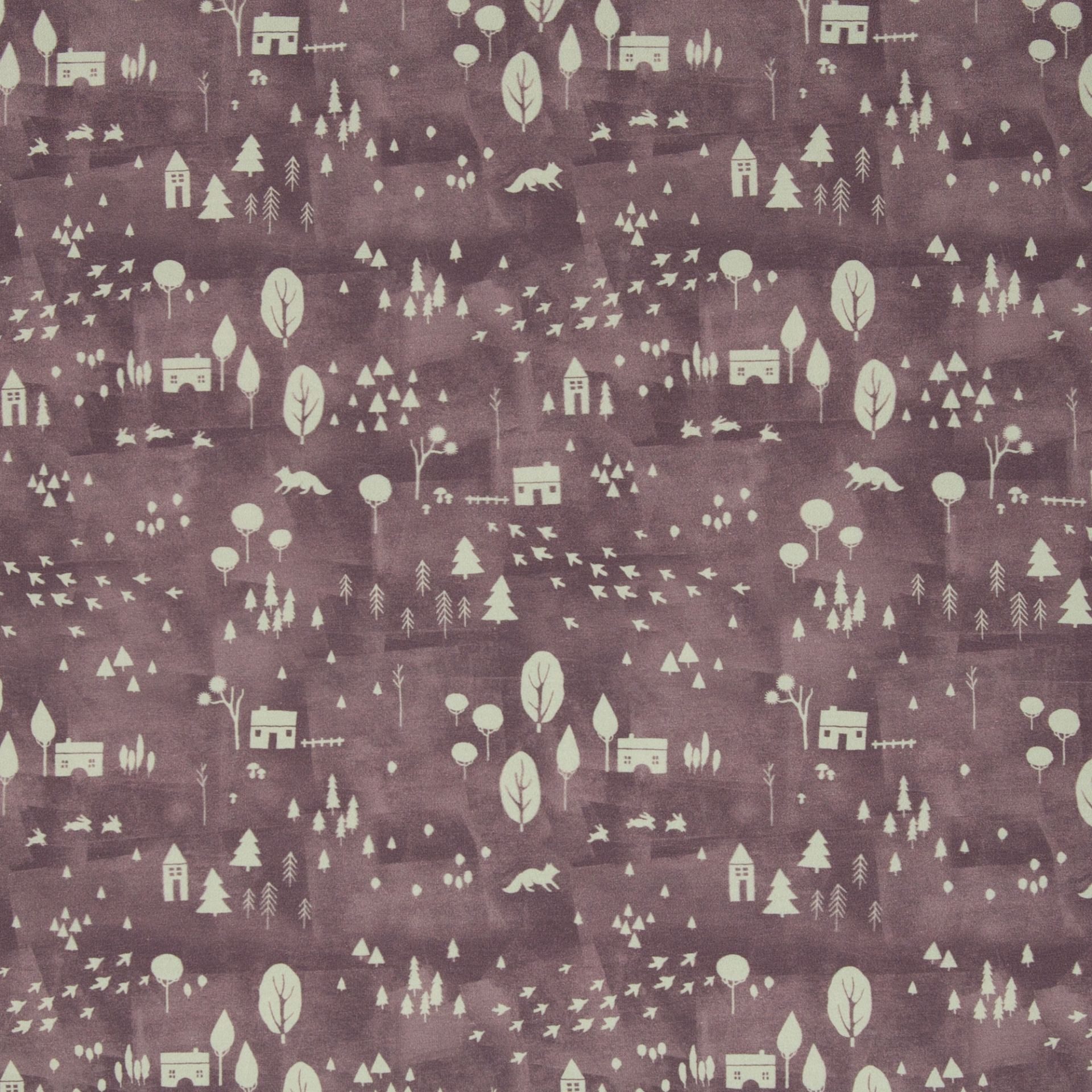 Dieser Baumwolljersey von Swafing entführt uns in eine idyllische Waldlandschaft. Auf einem zarten, fliederfarbenen Hintergrund sind in zartem Weiß silhouettenhafte Bäume, ein kleines Haus und verspielte Waldtiere wie Hasen und ein Fuchs abgebildet. Das dezente Farbspiel und die verspielten Motive machen diesen Stoff zu einem echten Hingucker und verleihen jedem Nähprojekt einen Hauch von Romantik und Naturverbundenheit.