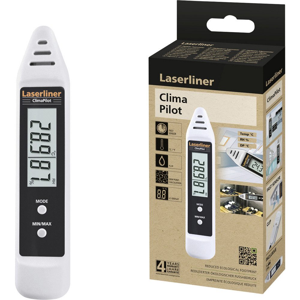 Das digitale Hygrometer ermöglicht die Prüfung des Raumklimas durch das Messen der relativen Luftfeuchte, der Umgebungstemperatur und die Anzeige des berechneten Taupunktes. Die schnelle Sensorik in der Fühlerspitze sorgt für eine kurze Messzeit. Praktisch bei der Nutzung ist die Anzeige des kleinsten oder größten Messwertes. Aufgrund des niedrigen Stromverbrauches ist das Gerät auch für Langzeitmessungen geeignet. Das Gehäuse besteht zu einem Großteil aus recyceltem Material und leistet einen wertvollen Beitrag zur Эко-товары