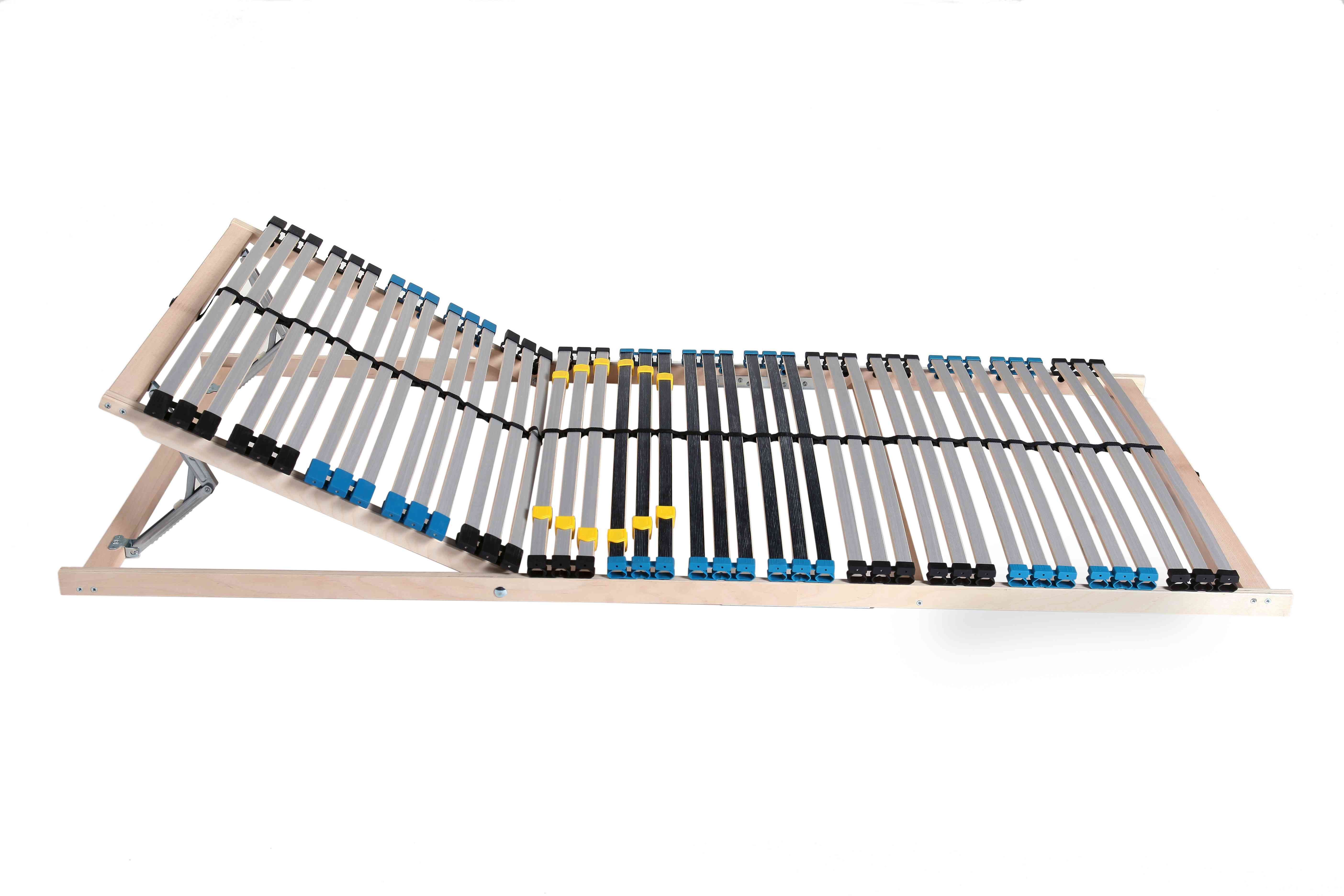 Mit seinen 42 elastischen Federholzleisten bietet dieser Lattenrost eine präzise, federnde Grundlage für jede Matratze. Die eng aneinander liegenden Leisten reagieren punktgenau auf Bewegungen und entlasten den Körper besonders in druckempfindlichen Bereichen wie Schulter und Hüfte. Die flexible Lagerung sorgt zudem für eine verbesserte Belüftung - ideal für ein ausgeglichenes Schlafklima. Die 7-Zonen-Aufteilung wurde gezielt entwickelt, um den Körper in allen Schlafpositionen ergonomisch zu unterstützen. Jede Zone passt sich den anatomischen Anforderungen einzelner Körperregionen an - von der weicheren Schulterzone bis zur stabilisierenden Beckenzone. So entsteht ein ausgewogener Liegekomfort mit klarer Ausrichtung auf gesunde Schlafhaltung. Ein besonderes Highlight ist das manuell verstellbare Kopfteil: Es lässt sich bequem in eine aufrechtere Position bringen - perfekt zum Lesen, Fernsehen oder Entspannen im Bett. Diese Funktion erhöht nicht nur den Komfort, sondern auch die Flexibilität im Alltag, gerade bei längeren Aufenthalten im Bett. Die Leisten sind in robusten Triokappen aus langlebigem Kautschuk gelagert, die nicht nur stabil, sondern auch angenehm leise sind. Diese flexible Aufhängung federt Bewegungen ab und verlängert die Lebensdauer des gesamten Lattenrostes. Der mittige Gurt unterstützt zusätzlich die gleichmäßige Lastverteilung und gibt der Liegefläche extra Stabilität. Die Konstruktion aus mehrfach verleimtem Schichtholz ist tragfähig und auf eine dauerhafte Belastung bis 140 kg ausgelegt. Der Lattenrost eignet sich ideal für moderne Kaltschaummatratzen oder Taschenfederkernmatratzen und ist eine verlässliche Basis für jahrelangen Schlafkomfort. Die einfache Selbstmontage macht den Aufbau unkompliziert und schnell - auch ohne handwerkliche Vorkenntnisse. Hinweis zur geteilten Ausführung bei großen Breiten Ab den Größen 160x200 cm, 180x200 cm und 200x200 cm besteht der Lattenrost aus zwei separaten Elementen: 160x200 cm (2x 80x200), 180x200 cm (2x 90x200) sowie 200x200 cm (2x 100x200). Diese Konstruktion sorgt für mehr Stabilität, bessere Anpassung an unterschiedliche Körperformen und eine längere Lebensdauer – besonders bei Doppelbetten.