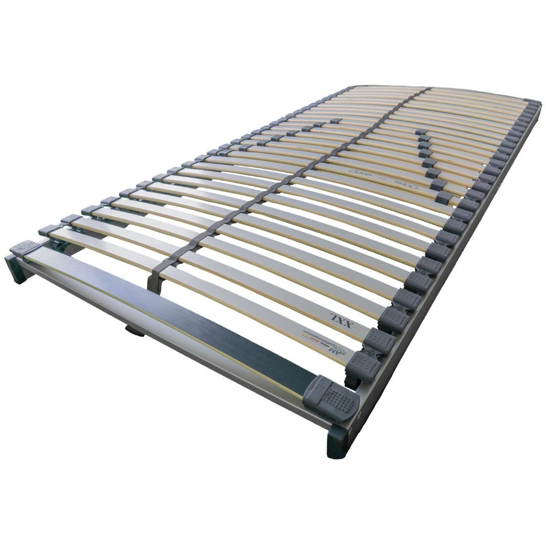 Top-Features | Hohe Belastbarkeit bis 240 kg 30 holmüberdeckende Federholzleisten aus Birke-Qualitätsschichtholz (geprüfte Emissionsklasse 1) Endpunktlager mit Doppelfedersystem 8-fach stufenlos verstellbare Mittelzone (Lordoseunterstüzung) Gebrauchsfertig geliefert Hergestellt in Deutschland 30 Nächte Probeschlafen |