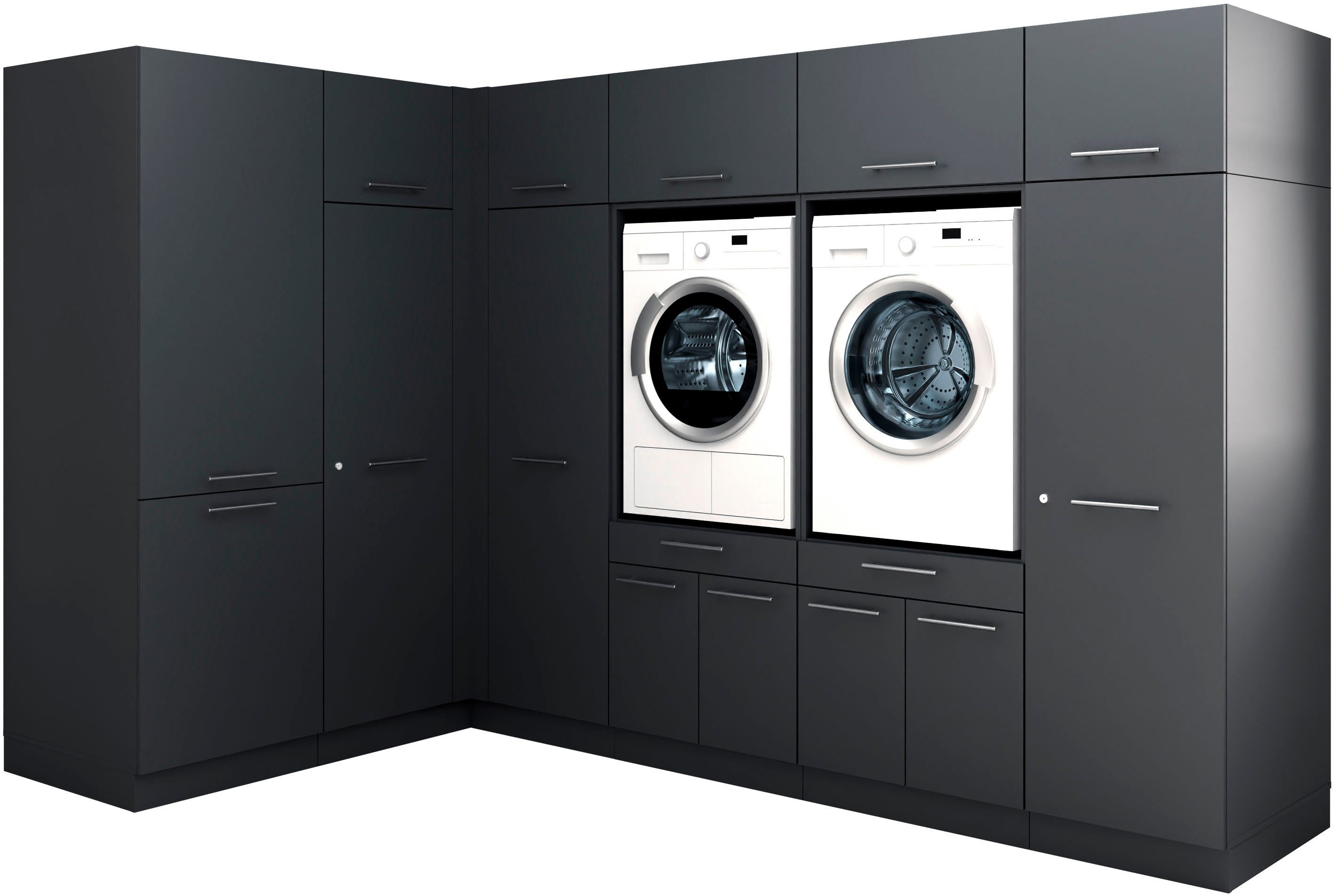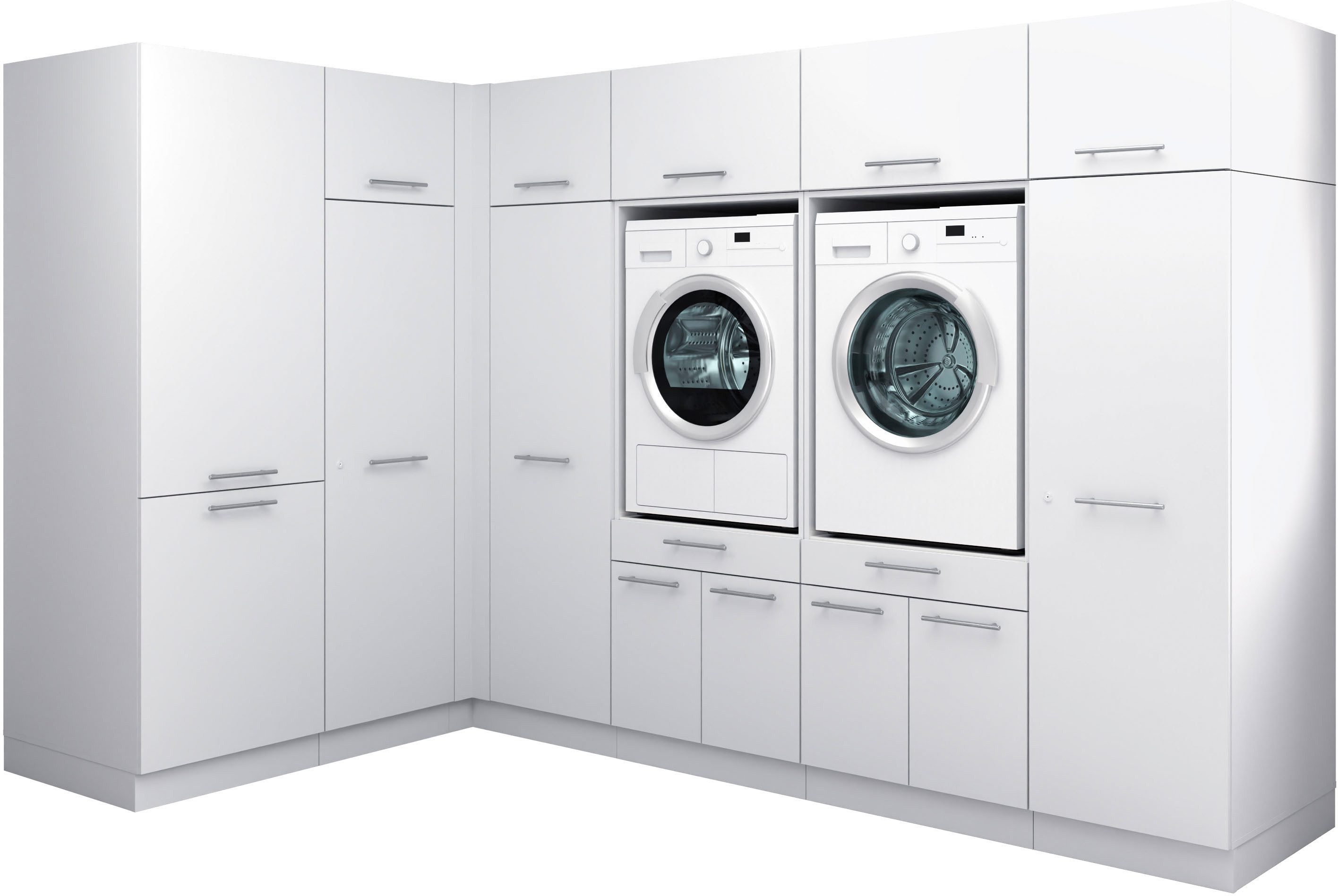 Set beinhaltet | 2x Waschmaschinenschränke, 5x Aufsatzschränke, 1 Mehrzweckschrank.1x Eckschrank, 1x Haushaltsschrank, 1x Kühlumbauschrank |
