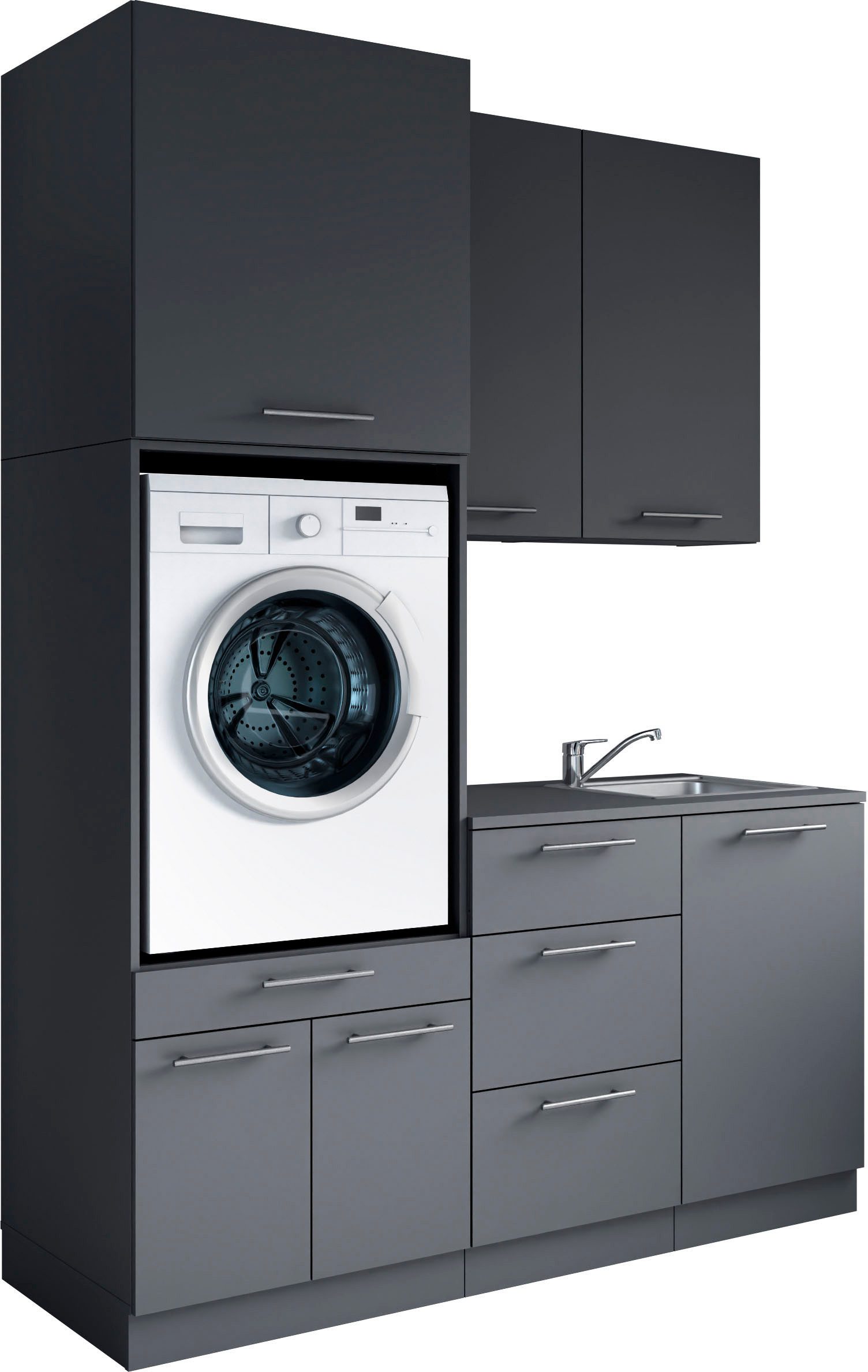 Set beinhaltet | 1x Waschmaschinenschrank, 1x Unterschränke, 2 Hängeschränke, 1 Aufsatzschrank 68, 1 Spülenschrank |