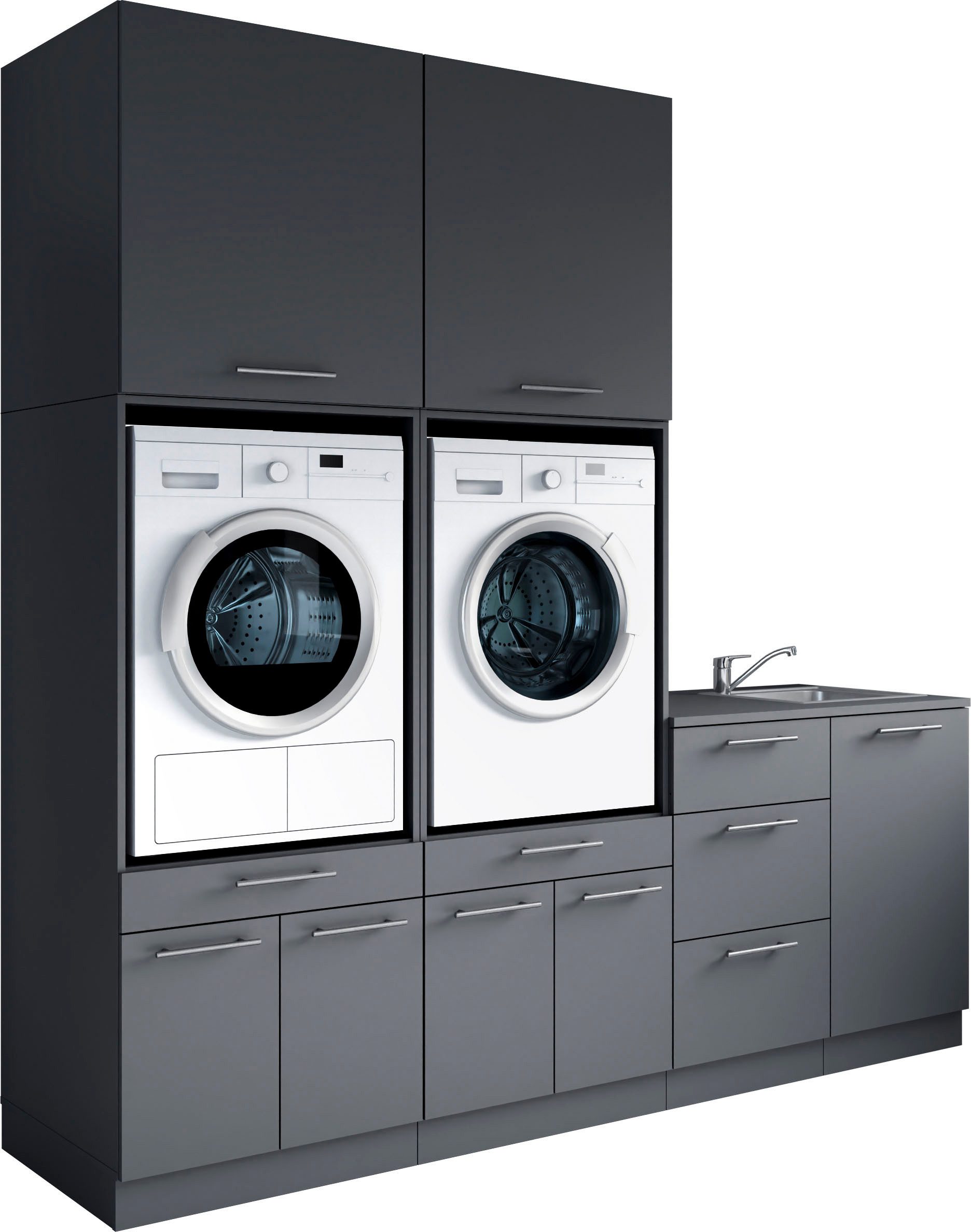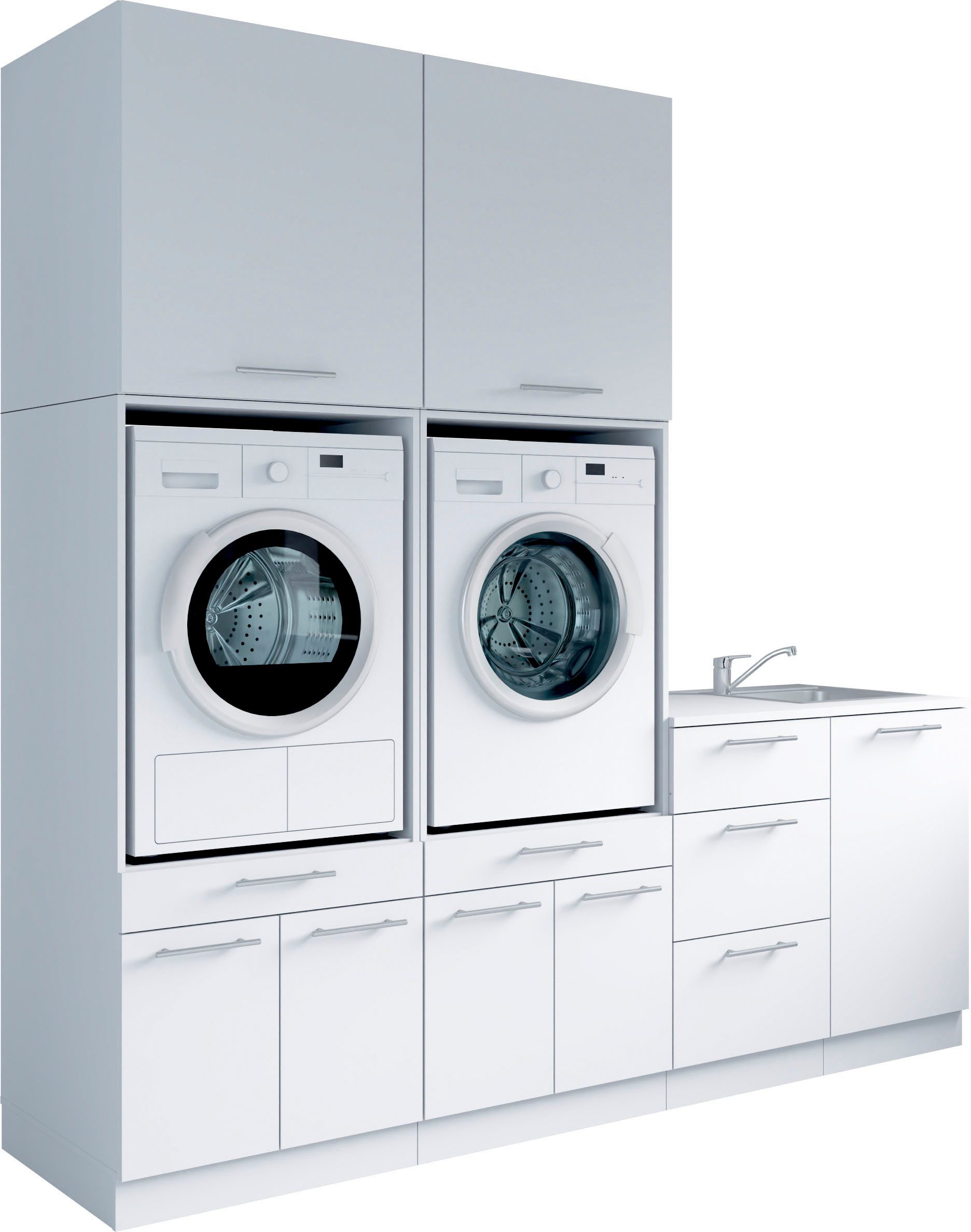 Set beinhaltet | 2x Waschmaschinenschränke, 1x Unterschränke, 2x Aufsatzschränke, 1 Spülenunterschrank |