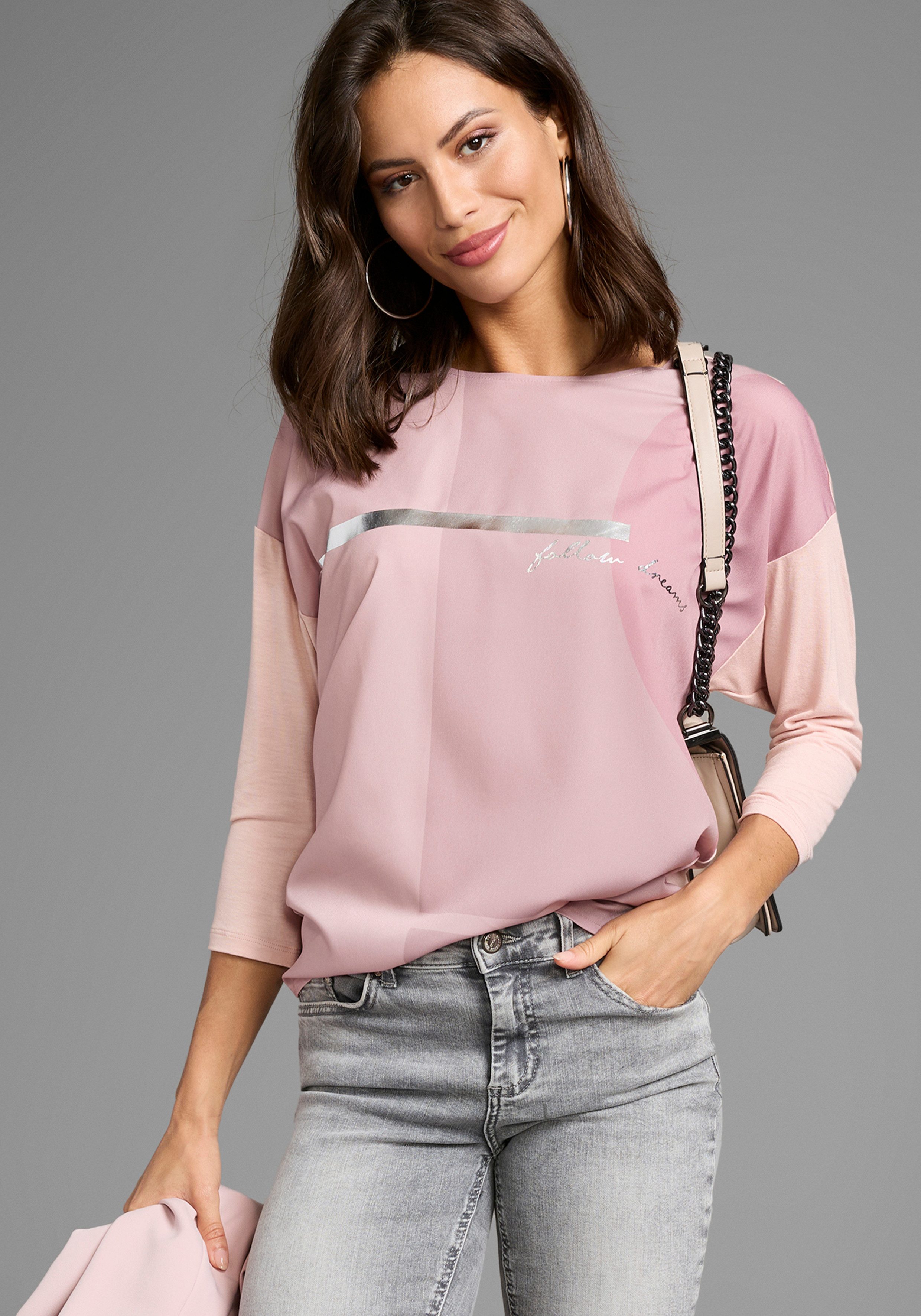 Die Shirtbluse von Laura Scott ist eine unkomplizierte Antwort auf die Frage "Was ziehe ich bloß zum Business-Meeting an?". Mit dem Aufdruck sieht sie lässig und peppig aus. Diese Bluse hat einen Rundhalsausschnitt und ist hüftlang sowie lässig geschnitten, sodass der Oberkörper locker betont wird.