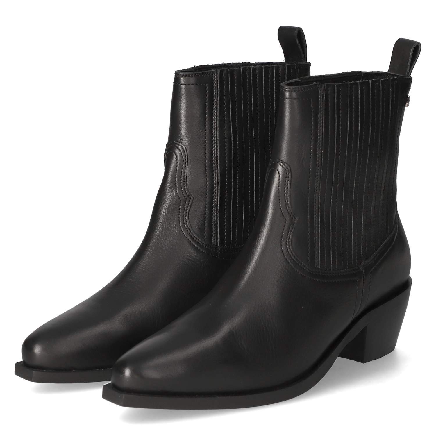Die Lazamani Damen Westernstiefeletten/Chelsea Boots in Schwarz aus Glattleder kombinieren trendiges Design mit hohem Komfort. Die Ziernähte im Westernstil verleihen den Stiefeletten einen markanten Look, während der verstärkte Fersenbereich zusätzliche Stabilität bietet. Die Anziehlasche erleichtert das Anziehen, und die seitlichen Elastikeinsätze sorgen für eine optimale Passform. Markendetails unterstreichen die Exklusivität der Stiefeletten. Das leicht gepolsterte Fußbett sorgt für zusätzlichen Komfort, und die flexible Laufsohle gewährleistet sicheren Halt und Bewegungsfreiheit auf verschiedenen Untergründen. Ideal für einen stilvollen und bequemen Auftritt.