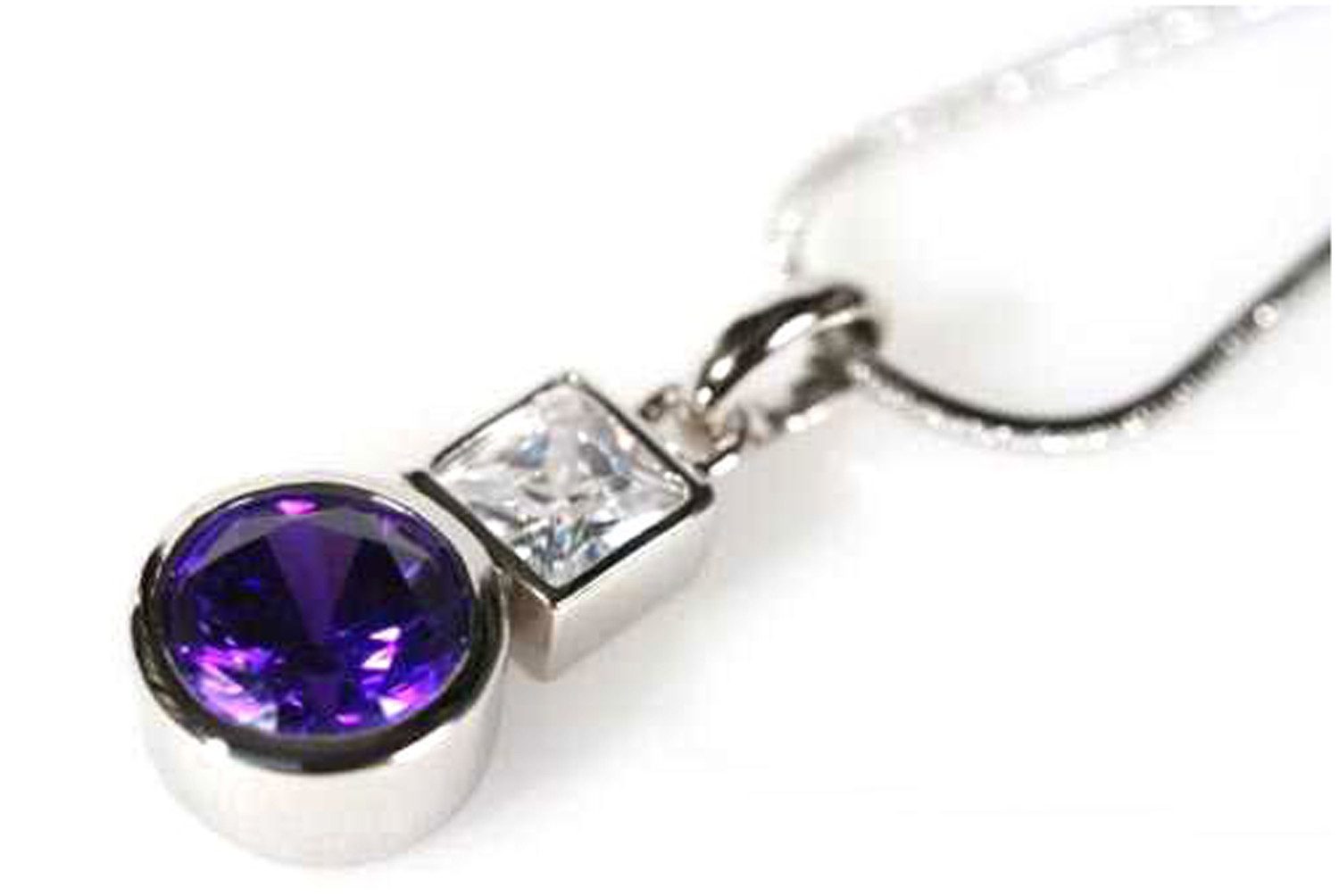 Длина: ca. 42 cm + 5 cm Regulationskettchen; Anhängerlänge: 30 mm; Zirkon: Durchmesser 10 mm, Carre: ca. 6 x 6 mm; Steinfarbe: ruby oder amethyst und crystal; Metall: Silber platiert + Rhodium.
