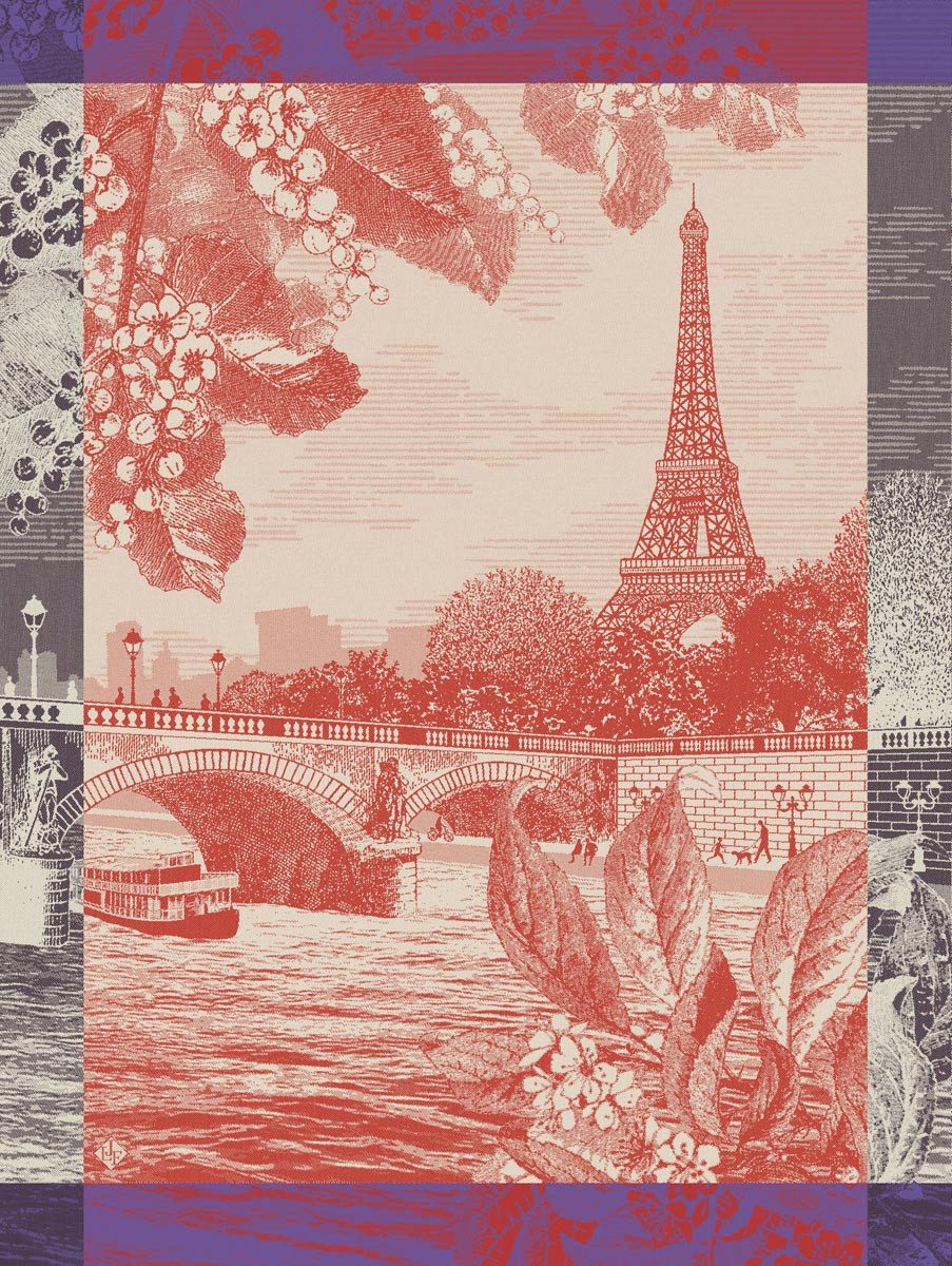 Pflegehinweise | MotivbeschreibungDieses Geschirrtuch zeigt eine stilisierte Darstellung von Paris mit der Eiffelturm und einer Brücke über der Seine. Das Design ist im Stil einer alten Gravur gehalten und verwendet eine Farbpalette aus Rot, Beige und Grau mit Akzenten von Lila. Die Szene wird durch üppige Blätter und Blüten im Vordergrund eingerahmt, was dem Ganzen eine romantische und künstlerische Note verleiht. |