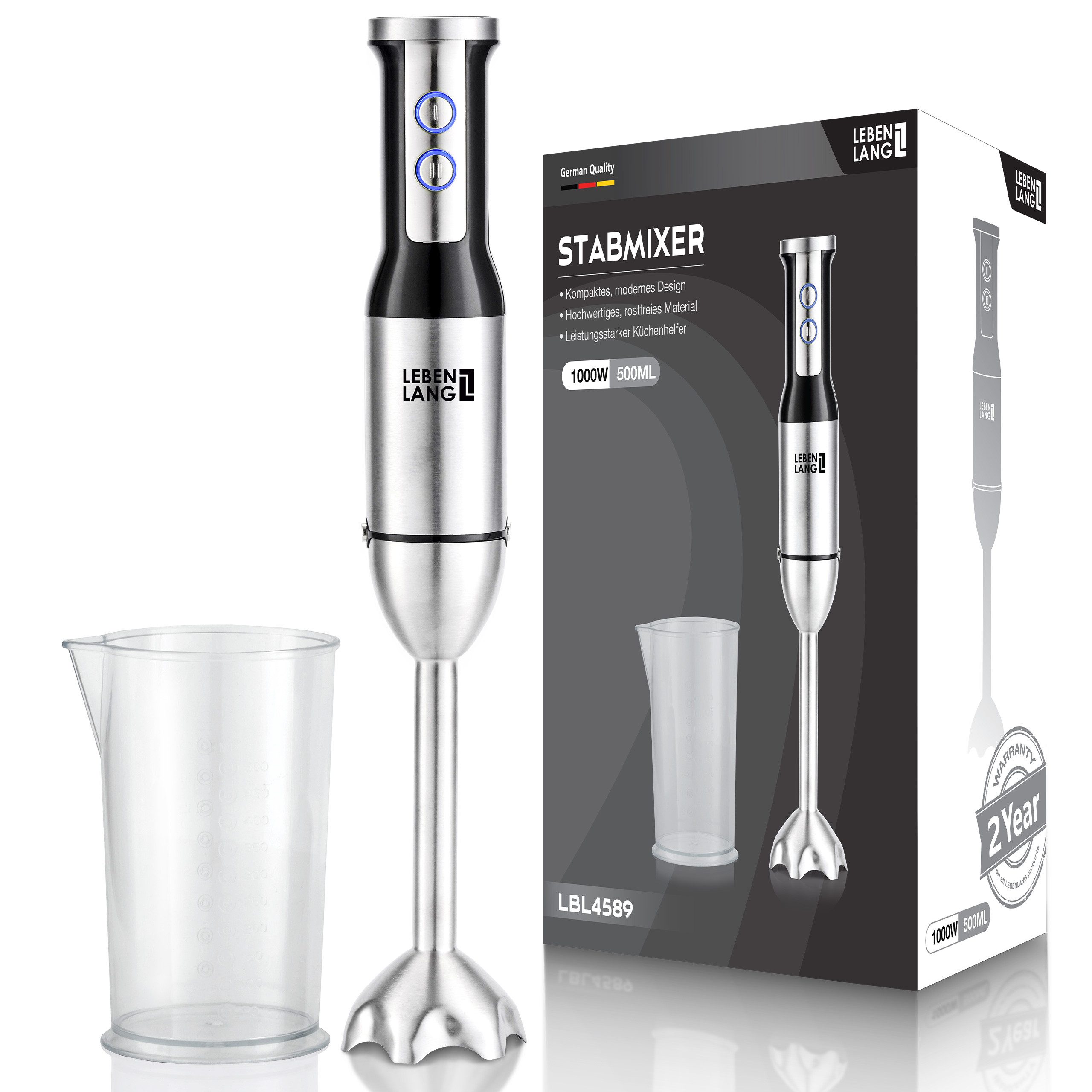 Erleben Sie eine neue Ebene kulinarischer Exzellenz mit dem LEBENLANG 1000W Mixstab aus Edelstahl. Dieses Küchengerät, ein kraftvoller Pürierstab, ist ein Meister des Mixens und Pürierens, der durch sein elegantes Design und einfache Handhabung besticht.