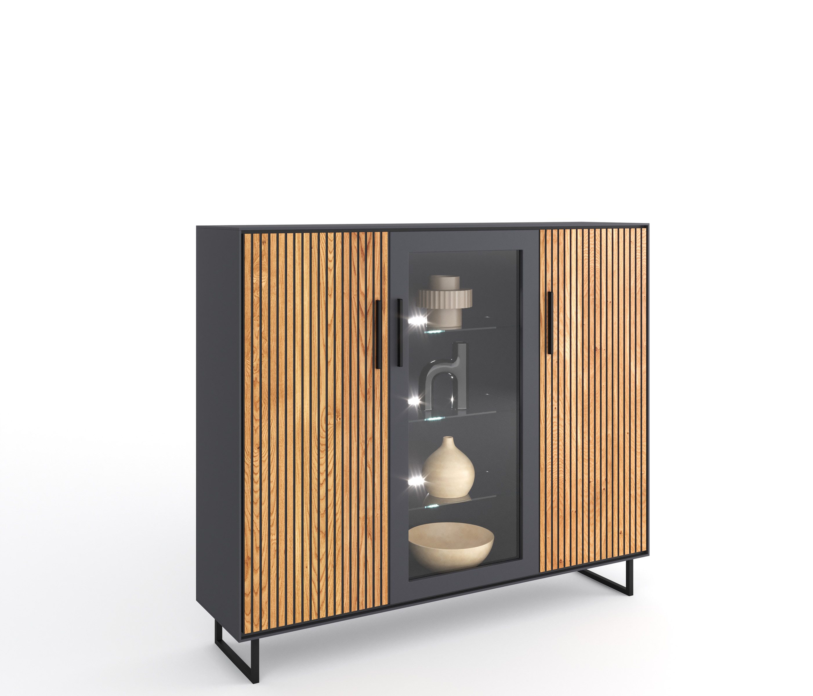 • Stilvolle Lamellenfront durch Akustikpaneel in Eiche teilmassiv und anthrazit – verleiht dem Highboard eine besondere, moderne Optik.