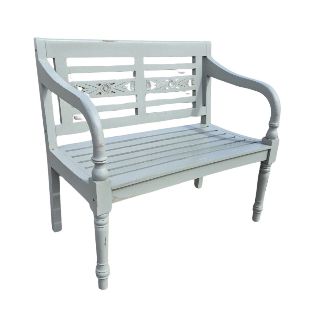 Diese Sitzbank ist aus Mahagoni in Handarbeit gearbeitet. Dieses ist sehr hart und widerstandsfähig. Die Lackierung ist im Shabby-Look aufgebracht worden, was dieser Bank einen Hauch von Nostalgie und Romantik verleiht. Die Rückenlehne / Streben sowieso die Beine sind in Handarbeit ausgearbeitet/verziert und unterstreichen ebenso den rustikalen Look dieser Sitzgelegenheit.