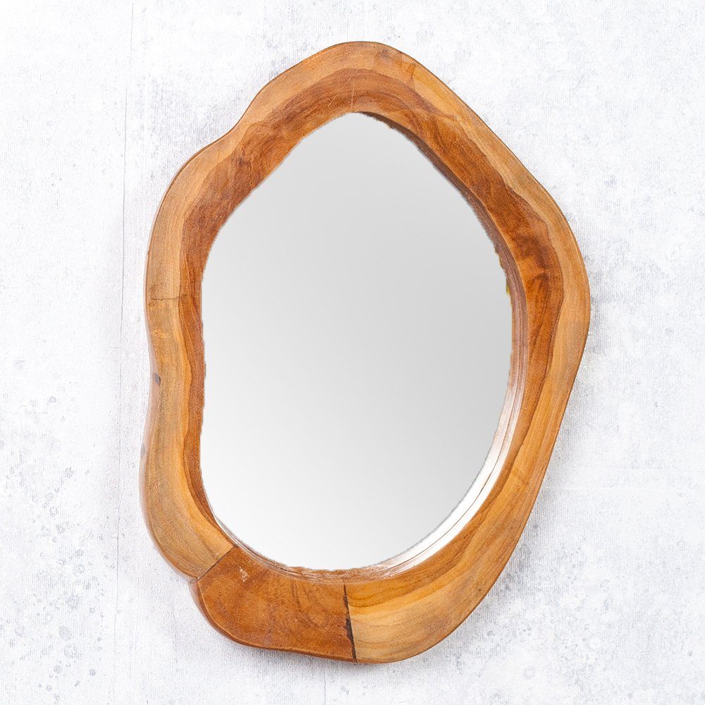 Handgefertigt aus massivem Teakholz - bezaubernd natürlich - das ist der urige Wandspiegel SLICE. Die immer einzigartige Rahmenform und individuellen Holzmerkmale machen jeden dieser Spiegel zu einem Unikat.