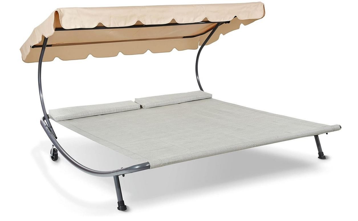 Entspannte Stunden zu zweit Die komfortable Doppelliege verspricht entspannte Stunden zu zweit im Freien. Eine Gartenliege, die Sie nicht mehr missen möchten. Erleben Sie die Kombination aus Komfort und Funktionalität mit unserer Outdoor-Doppelliege. Die Liege im Überblick: • Besonders große Liegefläche aus luftdurchlässigem, strapazierfähigem 4x4 gewebten Kunststoff-Outdoor-Gewebe, Farbton: Anthrazit meliert • Abnehmbare Kopfkissen • Wasserabweisendes, lichtgraues Sonnendach aus 100% Polyester • Stabiles Gestell aus anthrazitfarbigem, pulverbeschichtetem Stahlrohr; witterungsbeständig und langlebig • Leichtes Verschieben des Gestells dank Rollen am Kopfende • Maximale Belastung: 2 x 110 kg • Maße: 200 x 202 x 157 cm • Liegefläche 200 x 178 cm • Sitzhöhe 37 cm • Reinigung/Pflege: Polster sind waschbar und dank der offenen Gewebestruktur einfach zu reinigen • Liegefläche und Sonnendach sind bei Bedarf austauschbar Lieferumfang: 1 x Doppelliege mit Sonnendach, 2 x abnehmbare Kopfkissen, 1 x Montageanleitung Hinweis: Die verwendeten Materialien sind witterungsbeständig. Wie bei allen Outdoormöbeln wird empfohlen, diese bei längerem Nichtgebrauch unterzustellen, einzulagern oder mit einer Schutzhaube abzudecken. Polster und Kissen sind grundsätzlich nur bei Gebrauch aufzulegen und ansonsten trocken und geschützt aufzubewahren.