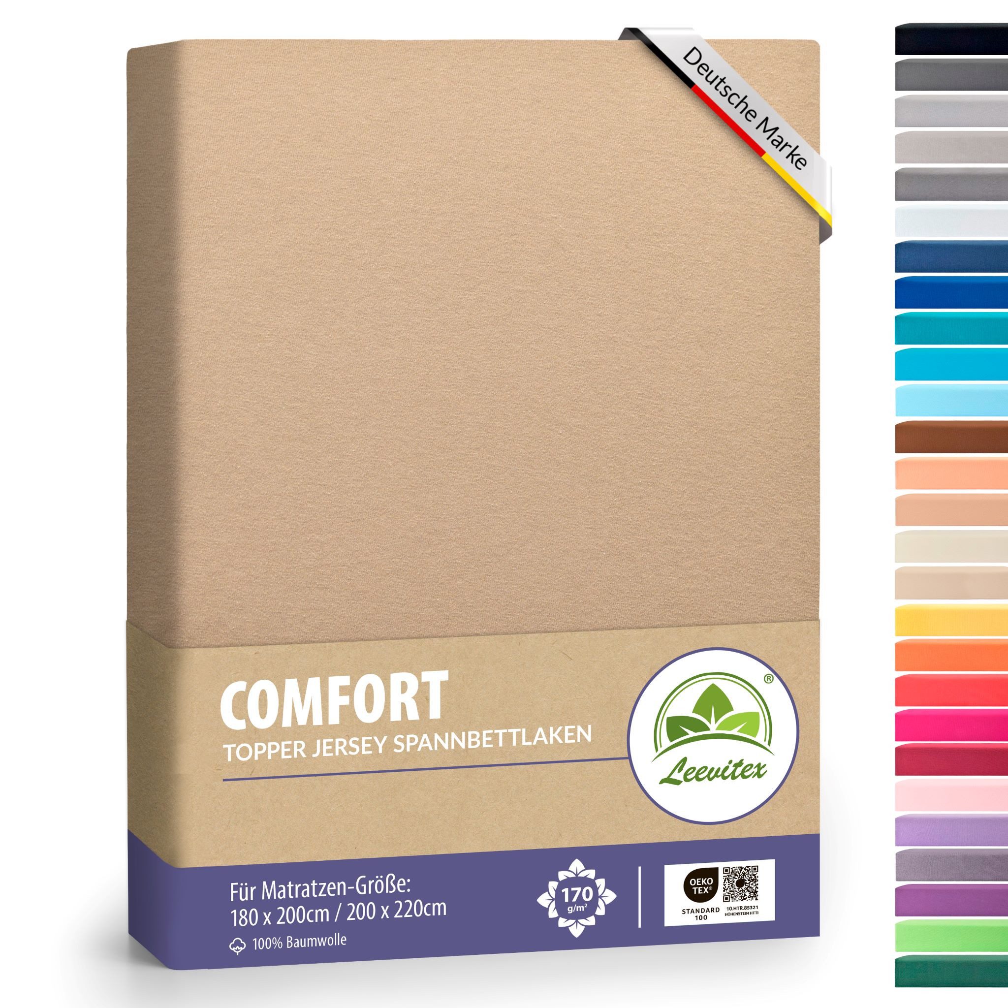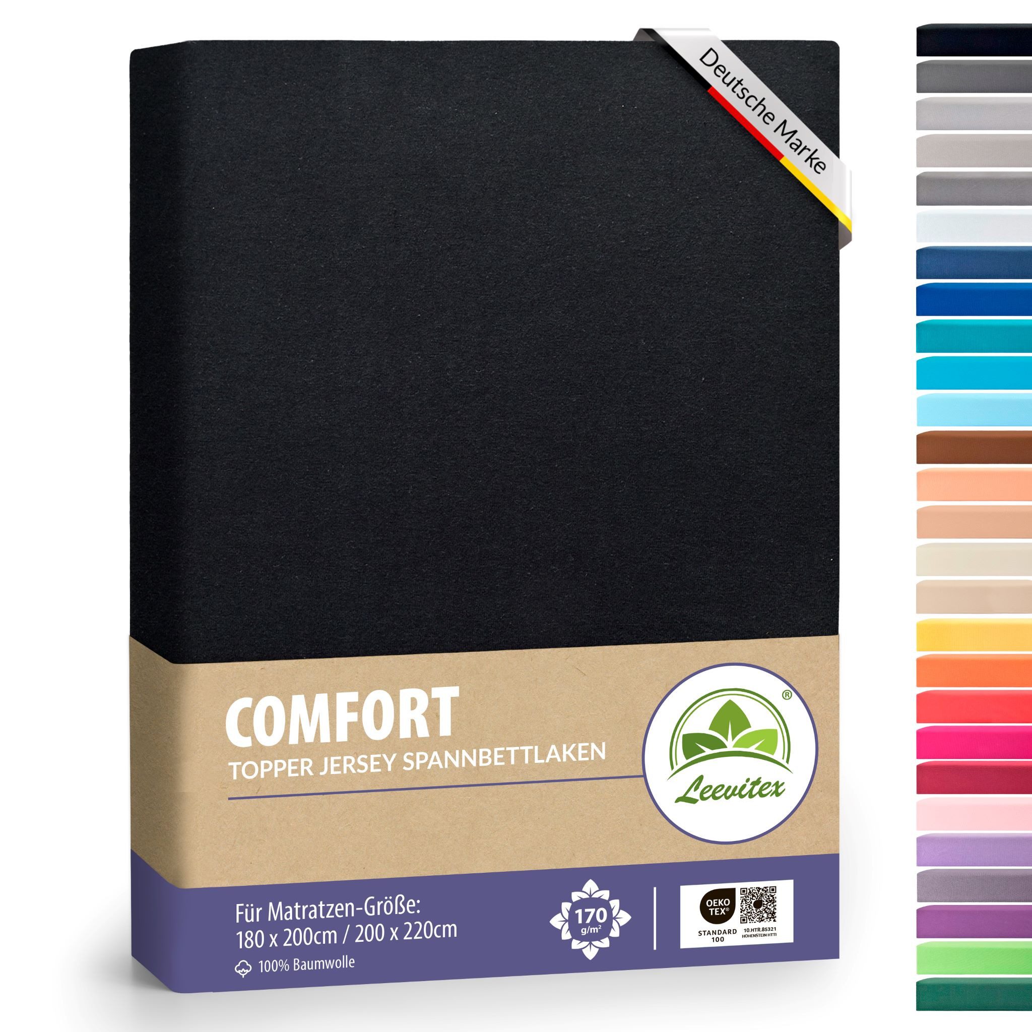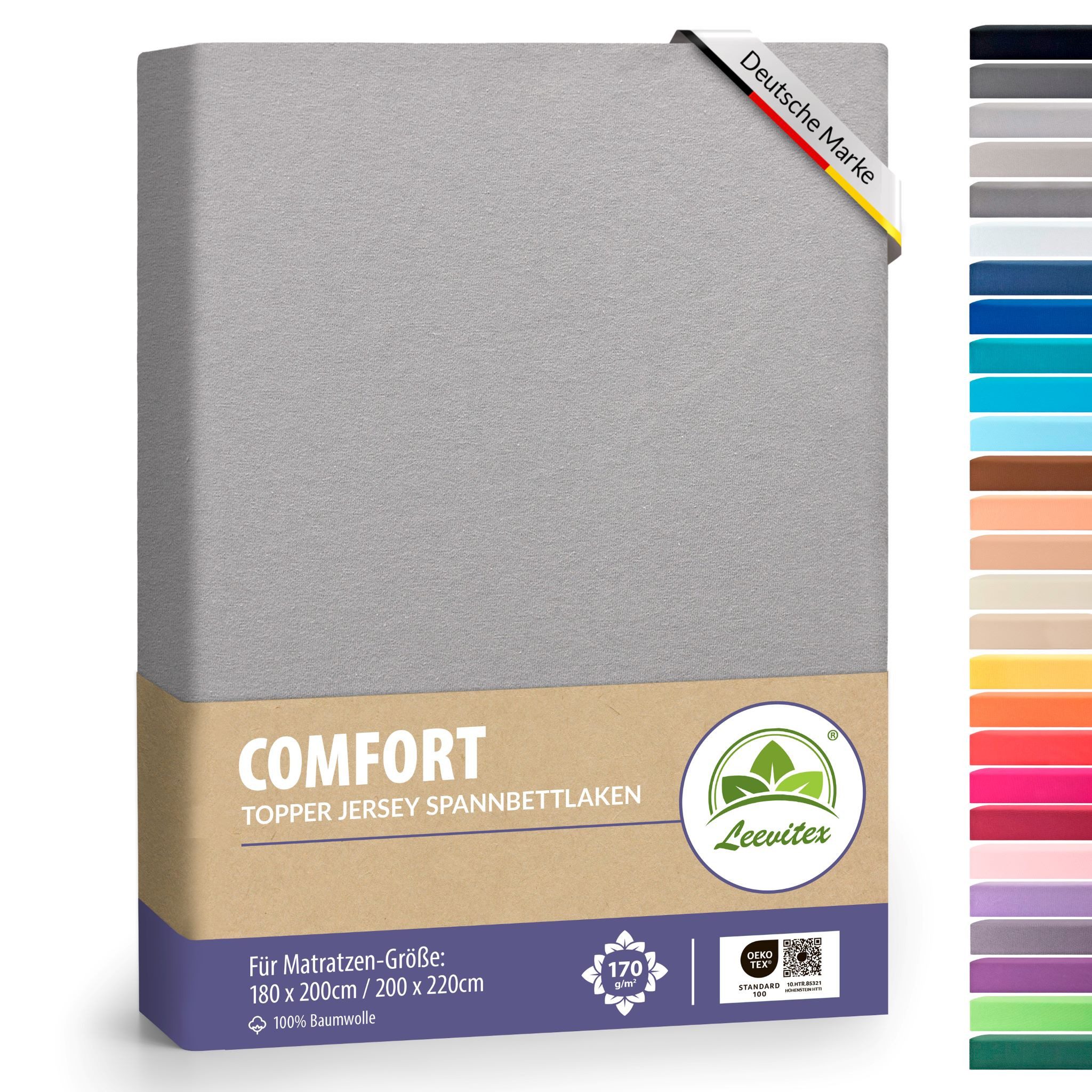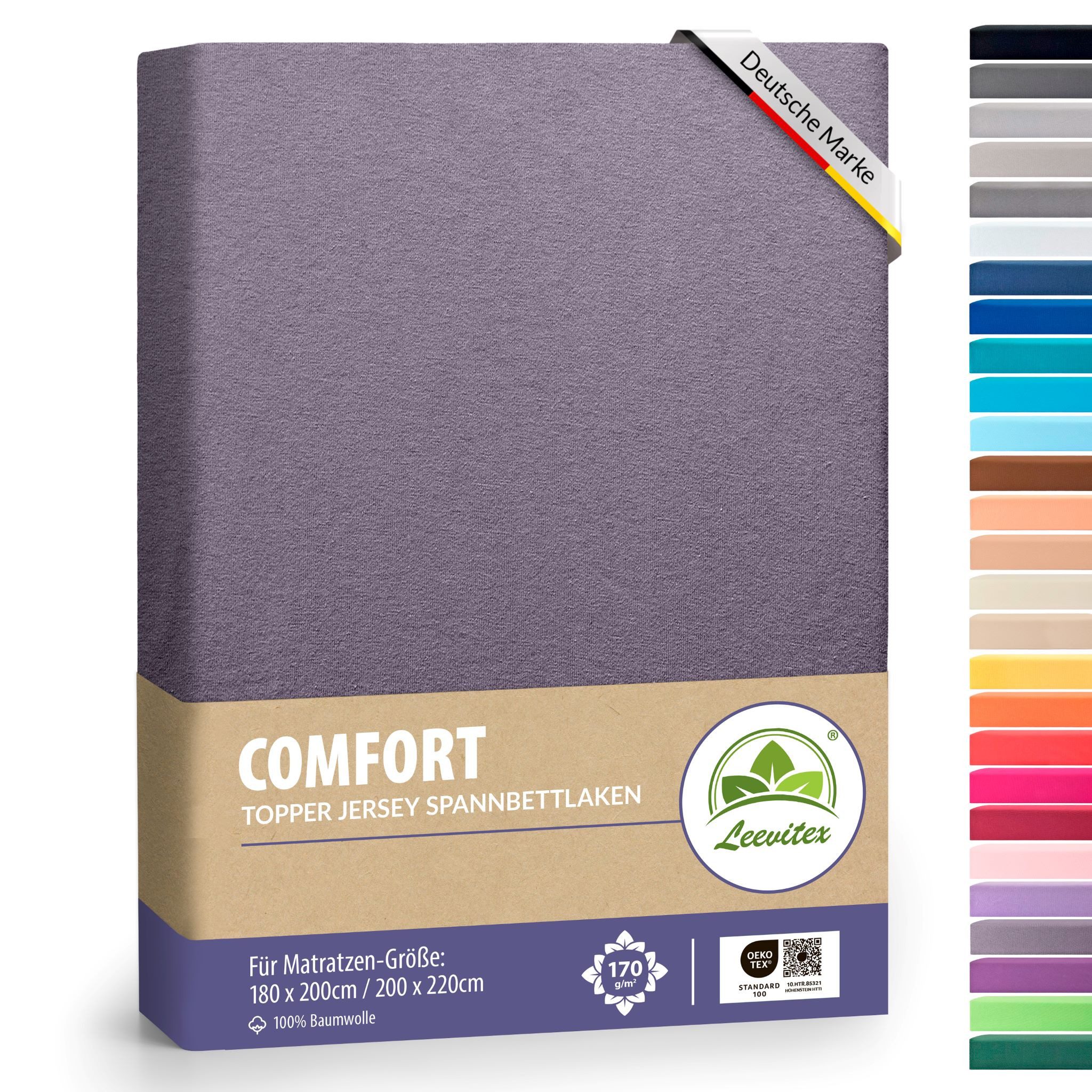 Es gibt kaum etwas Schöneres, als nach einem anstrengenden Arbeitstag in einem frisch bezogenen Bett endlich Entspannung zu finden. Wir haben es zu unserer Aufgabe gemacht, Ihnen passende Spannbettlaken für Topper zu einem fairen Preis anzubieten. Unsere Topper Bezüge gibt es in verschiedenen Farben und Größen und sind genau auf Ihre Bedürfnisse abgestimmt. Jersey-Spannbettlaken für Topper von leevitex bestehen aus 100% Jersey-Baumwolle, sind elastisch, atmungsaktiv und klimaregulierend. Bei unseren Topper-Spannbettlaken setzen wir auf die besondere Webart (Jersey-Baumwolle). Jersey besteht aus 100% feinst gekämmter Baumwolle und überzeugt mit einer hohen Faserdichte. Seine Festigkeit und Dehnbarkeit machen Jersey zum klassischen Material für die Herstellung von Bettwäsche. Dank dieser Qualitäten ist Jersey besonders gut geeignet für Matratzen mit einer größeren Höhe, wie z.B. Wasserbett- und Boxspringmatratzen. Die Topper Spannbettlaken verfügen über eine ca. 18 cm Steghöhe und eignen sich für Topper, Toppermatratzen und Topperauflagen (außer Softtopper-Auflagen) von Boxspringbetten und alle Matratzen mit einer maximalen Höhe von 12 cm. Aufgrund der speziellen Verarbeitung sind unsere Topper Bezüge strapazierfähig und spannbar. Da sie über einen praktischen Rundumgummizug verfügen, lassen sie sich ganz einfach über die Matratze ziehen. Sie sitzen dabei fest und werfen dabei Falten. Sie verrutschen kaum, auch wenn Sie sich im Schlaf viel bewegen. Da wir eine große Auswahl an verschiedenen Größen in unserem Меню führen, können Sie das Topper Spannbetttuch auf Ihre Schlafzimmereinrichtung abstimmen. So verleihen Sie Ihrem Schlafzimmer eine ganz besondere Atmosphäre.