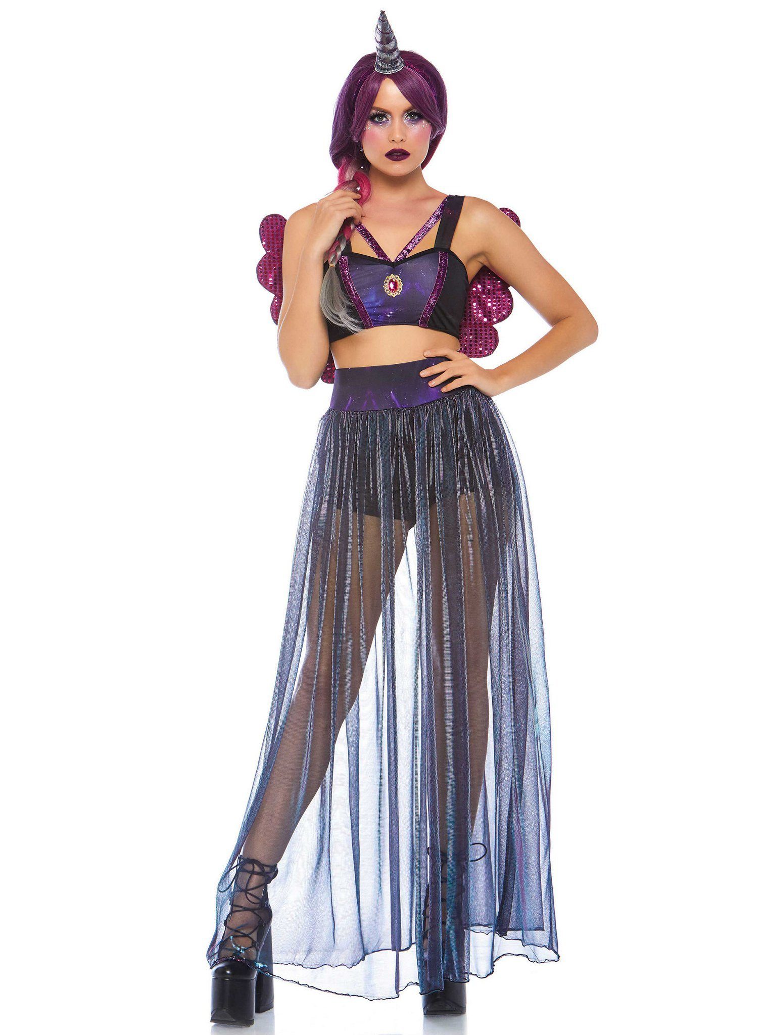 Ausstattung | - Galaktisches Einhorn Kostüm vierteilig- mit Trägertop- High-Waist-Shorts mit angenähtem Schleierkleid und Einhornschwanz- mit Flügeln- mit Einhornhaarband |