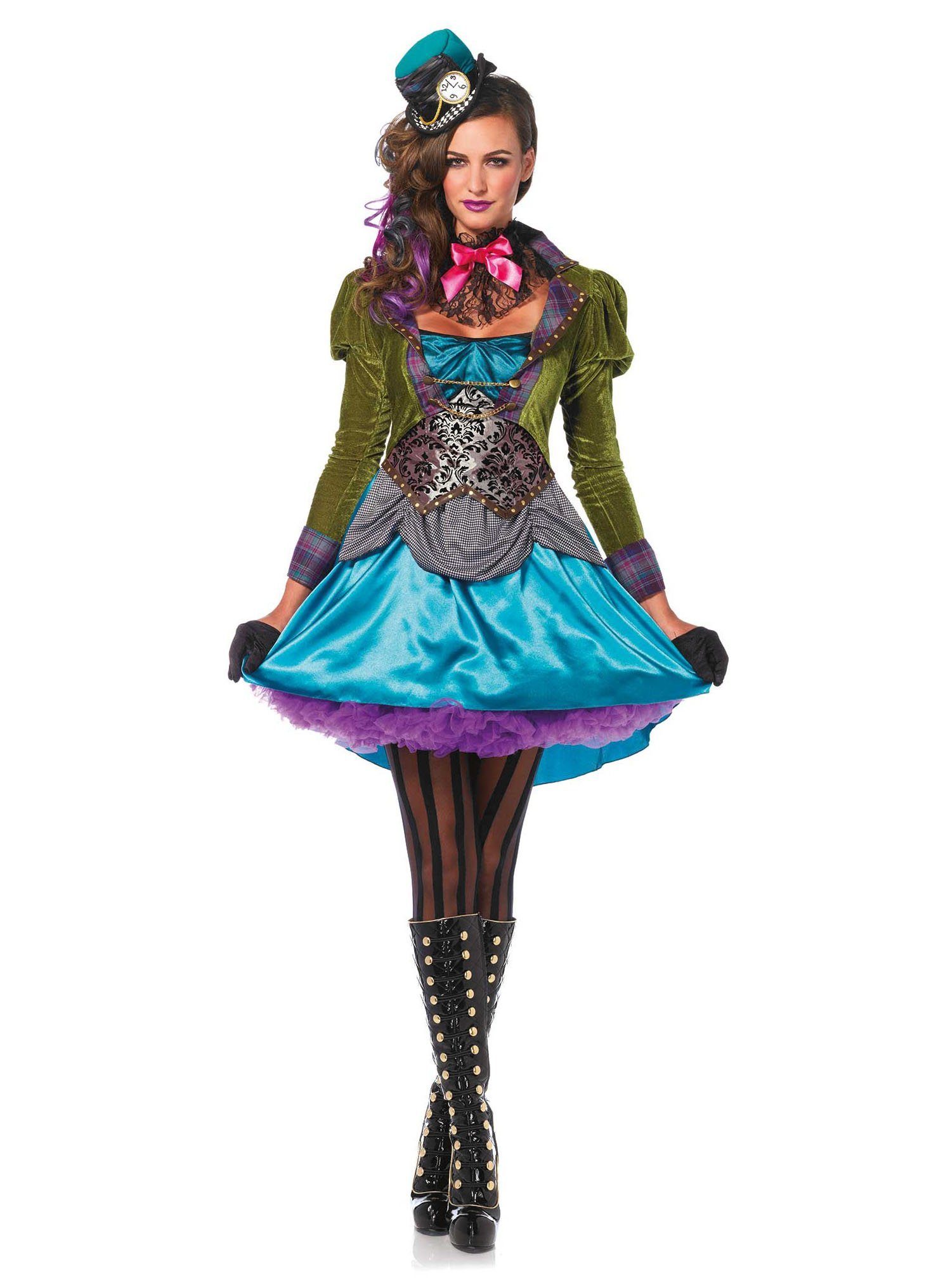 Ausstattung | - Verrückte Hutmacherin Deluxe Kostüm dreiteilig- mit Kleid mit angenähter Jacke- mit Halsschmuck- mit Hut- ohne Petticoat, Strumpfhose, Handschuhe und Stiefel |