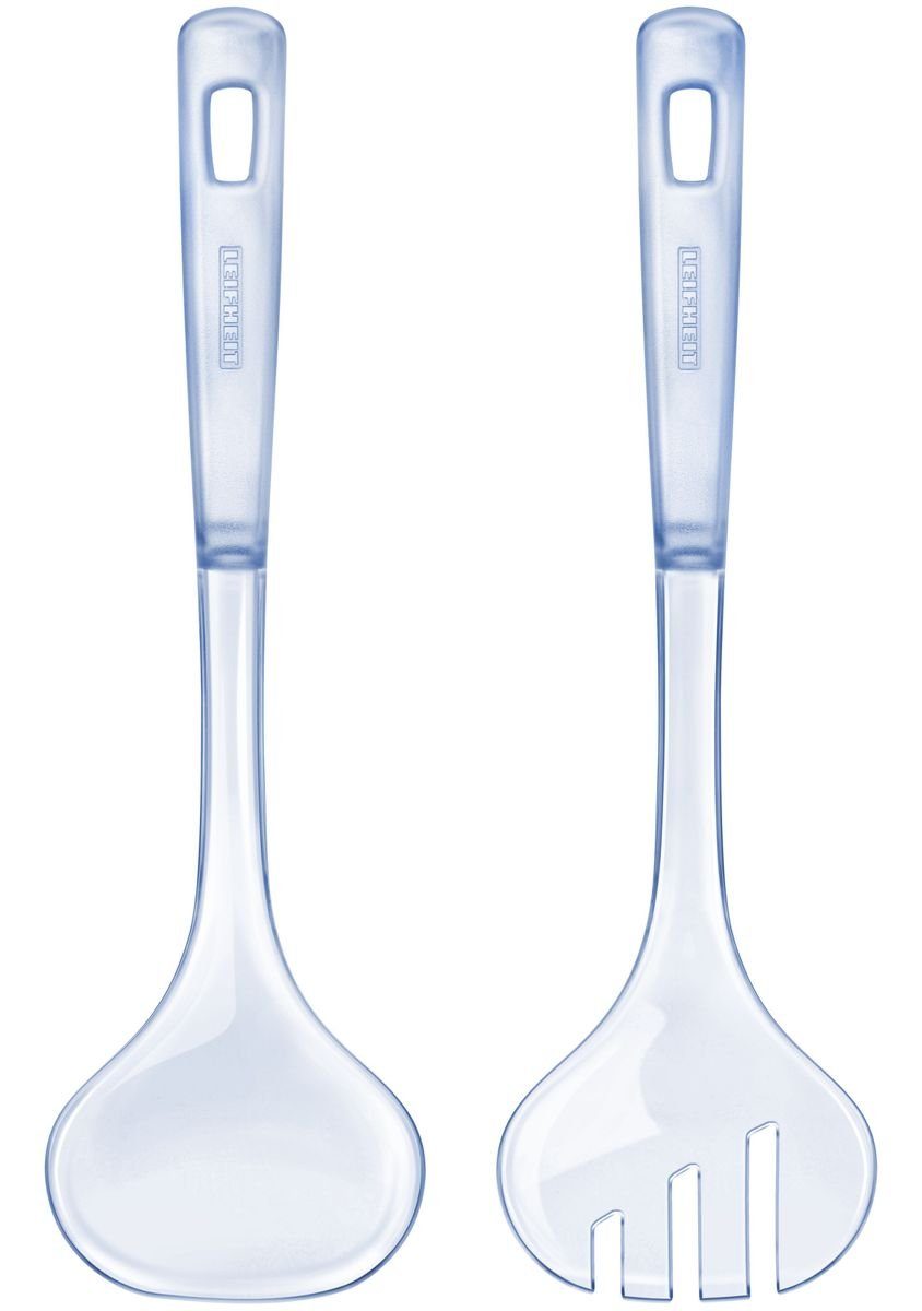 Das Leifheit Salatbesteck aus glasklarem Kunststoff besitzt zwei praktische Haken, mit denen das Besteck sicher am Schüsselrand hängt.