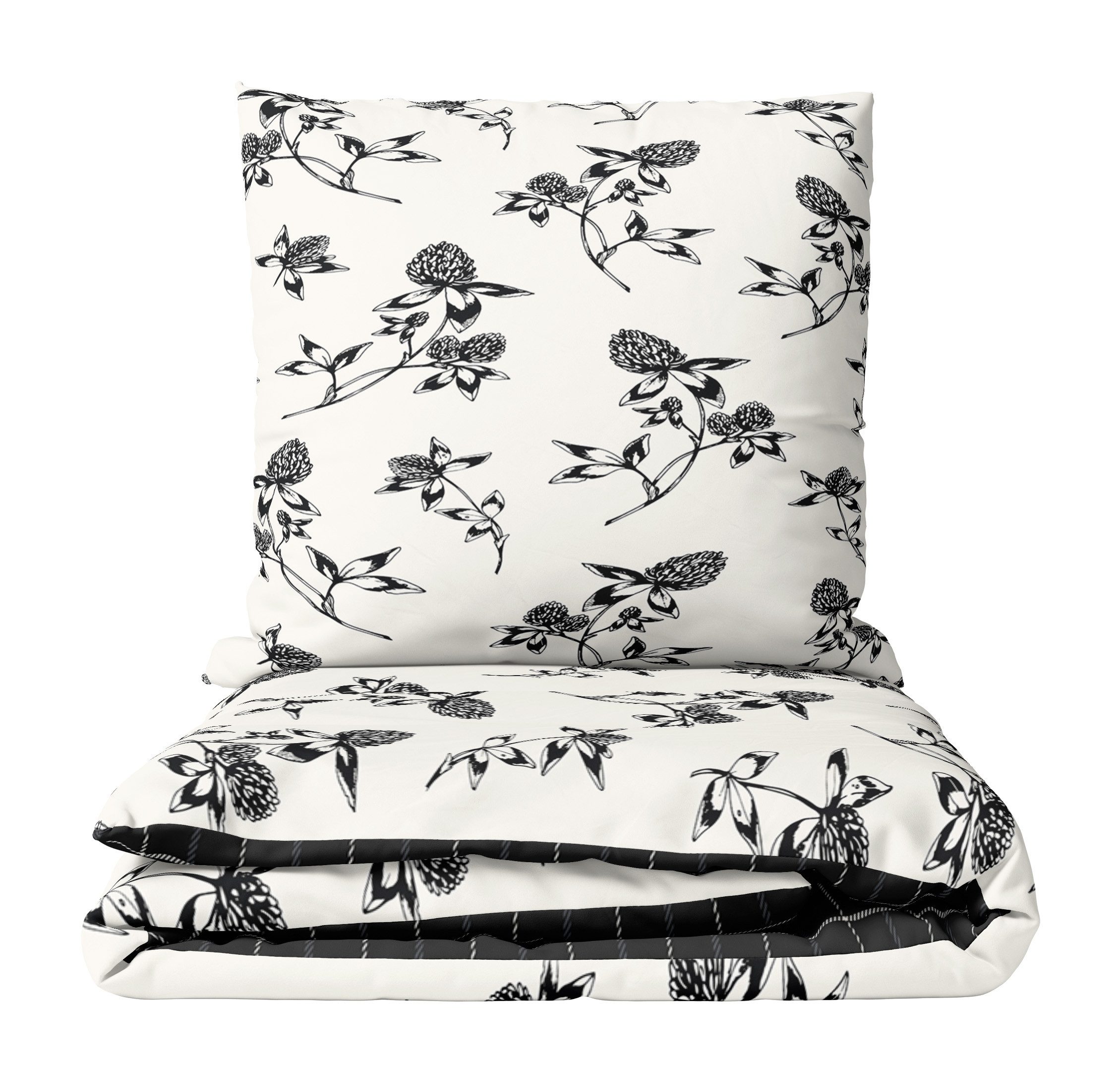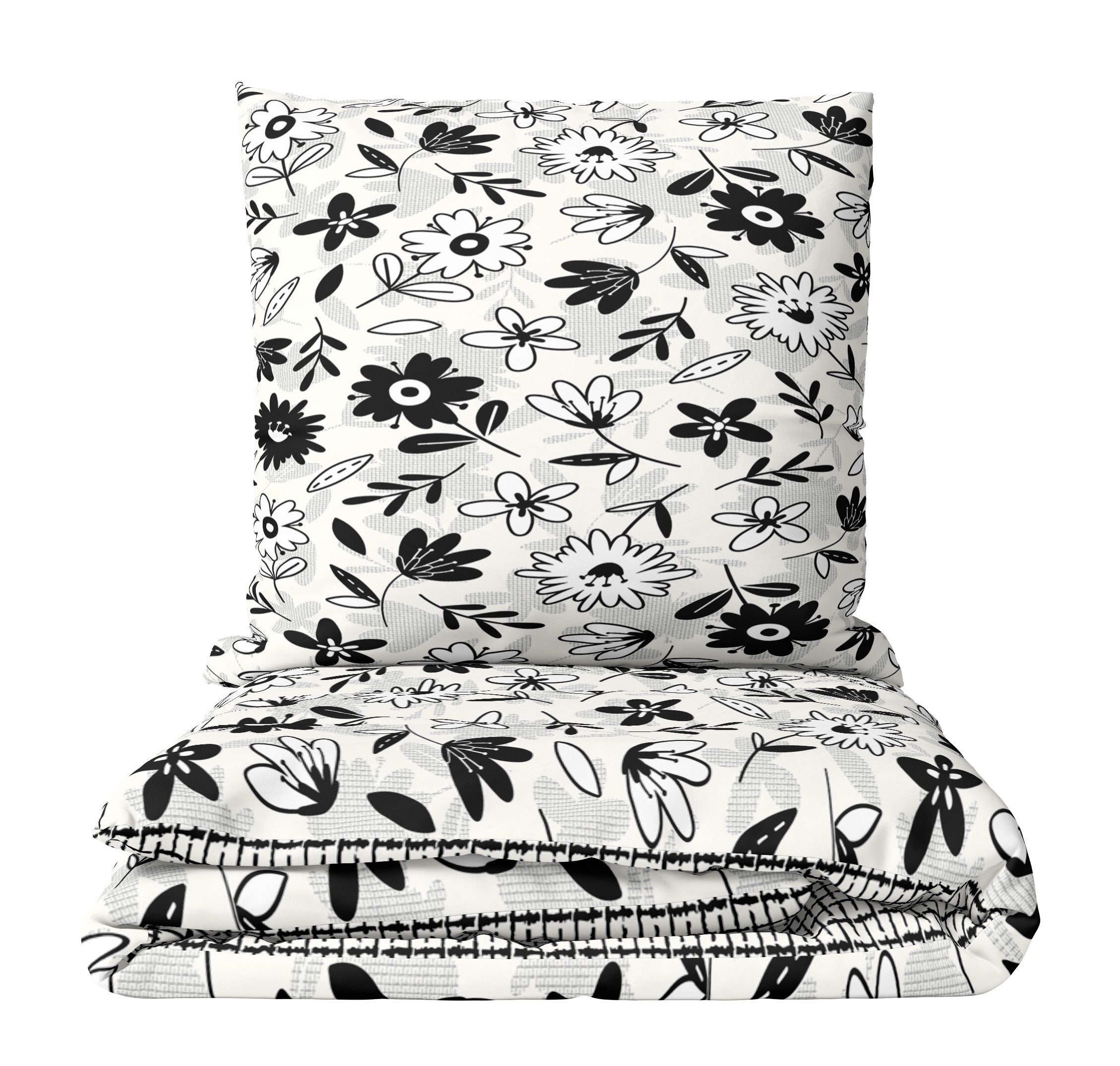 Diese Garnituren überzeugen durch ihr edles, florales Design in Schwarz, Grau und Weiß sowie eine praktische Wendeseite in wahlweise kariertem oder meliertem Muster.