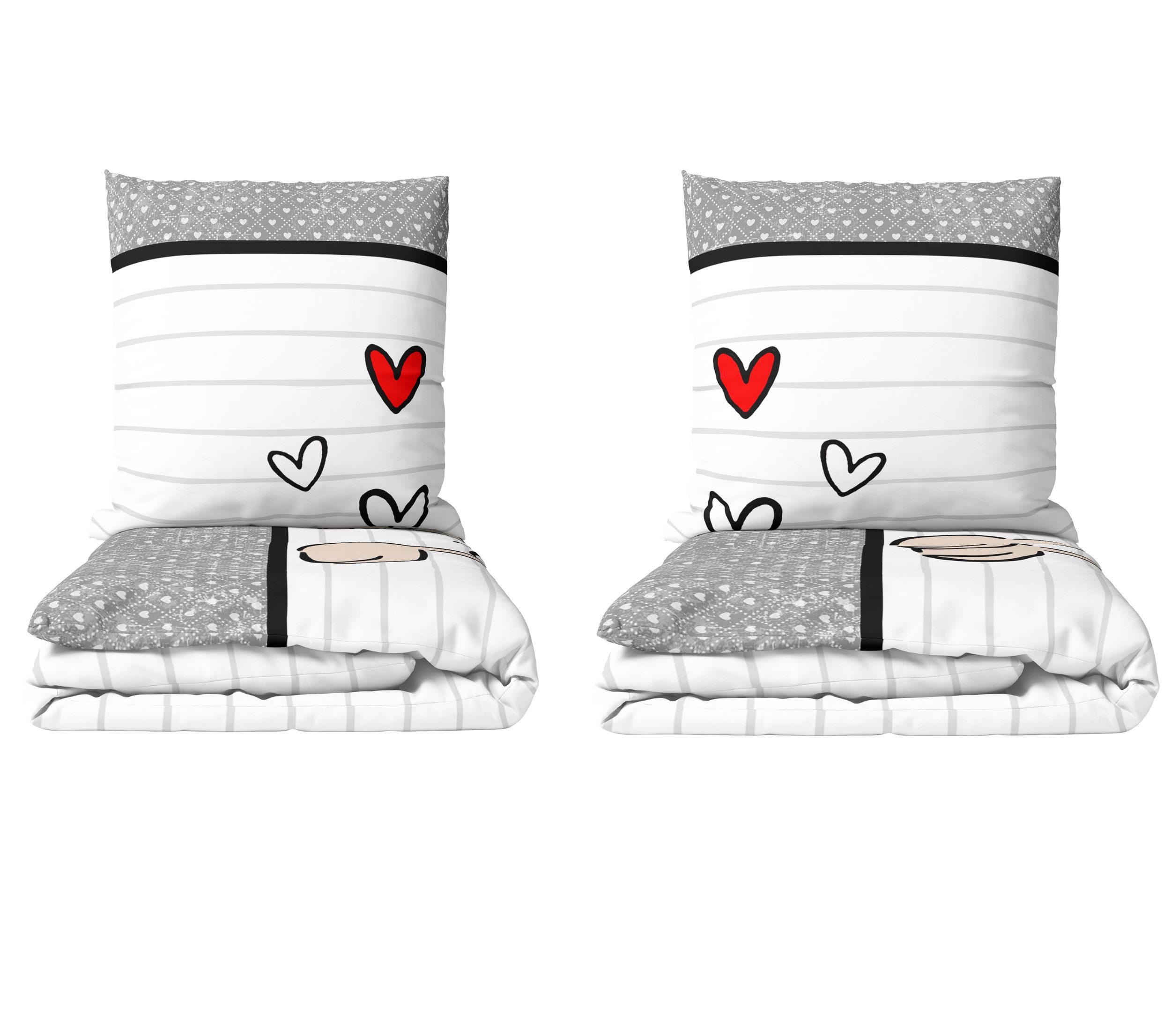 Verleihe deinem Schlafzimmer eine liebevolle Note mit der 4-teiligen Partnerbettwäsche. Das verspielte Schaf-Motiv mit Herzchen auf neutralem Hintergrund in Weiß, Grau und Beige bringt nicht nur Wärme und Charme ins Schlafzimmer, sondern sorgt auch für kuschelige Zweisamkeit.