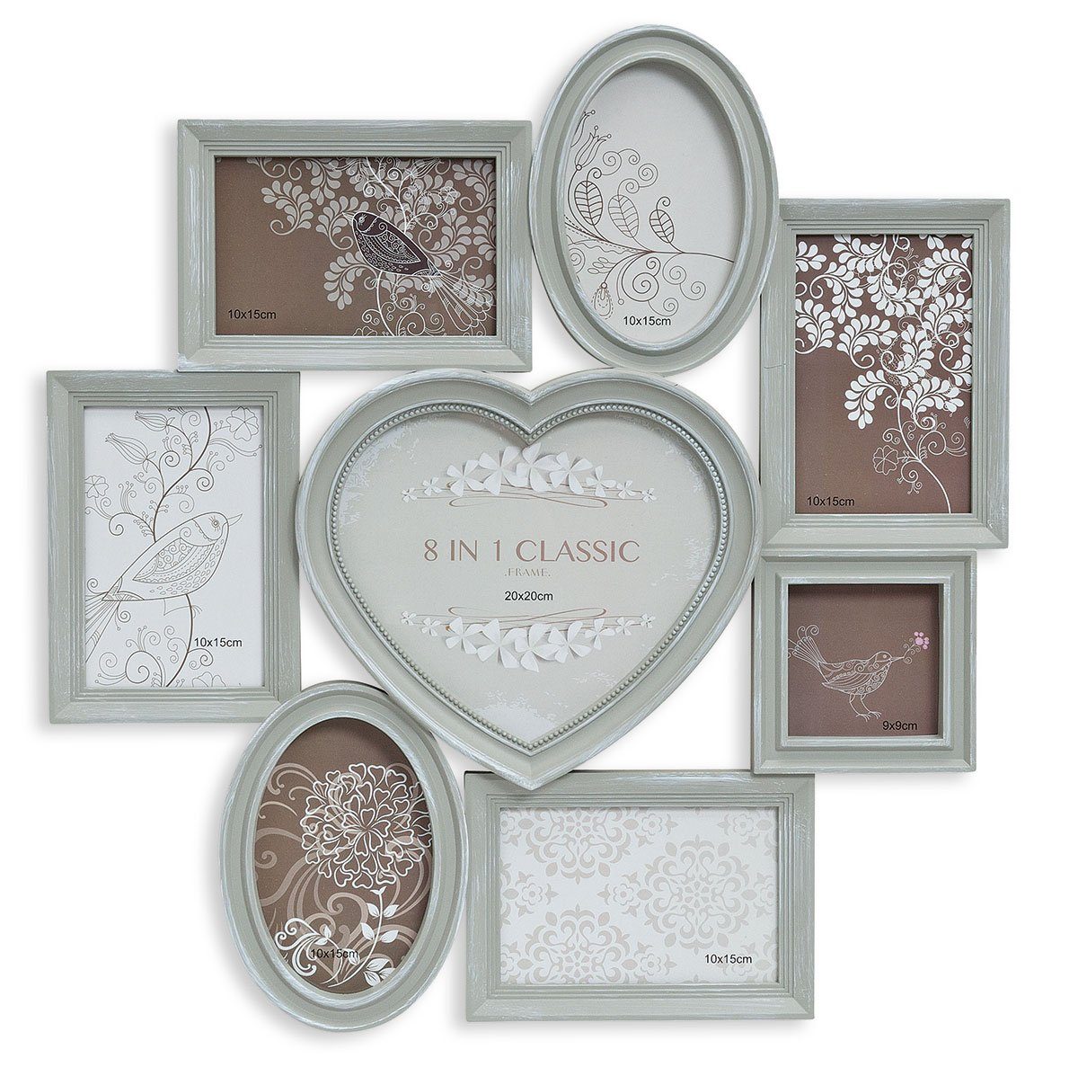 - Anzahl der Fotos: 8 Fotos - Bildformate: 6mal 10x15cm, 1mal 9x9cm und 1mal 20x20cm - Material der Fotogalerie: Kunststoff mit Glasscheiben - Размер des BilderrahmensB x H x T: ca. 48 x 49 x 2 cm - Farbe der Collage: grau weiß gewischt - Stil der Bildergalerie: Shabby Chic, Landhaus