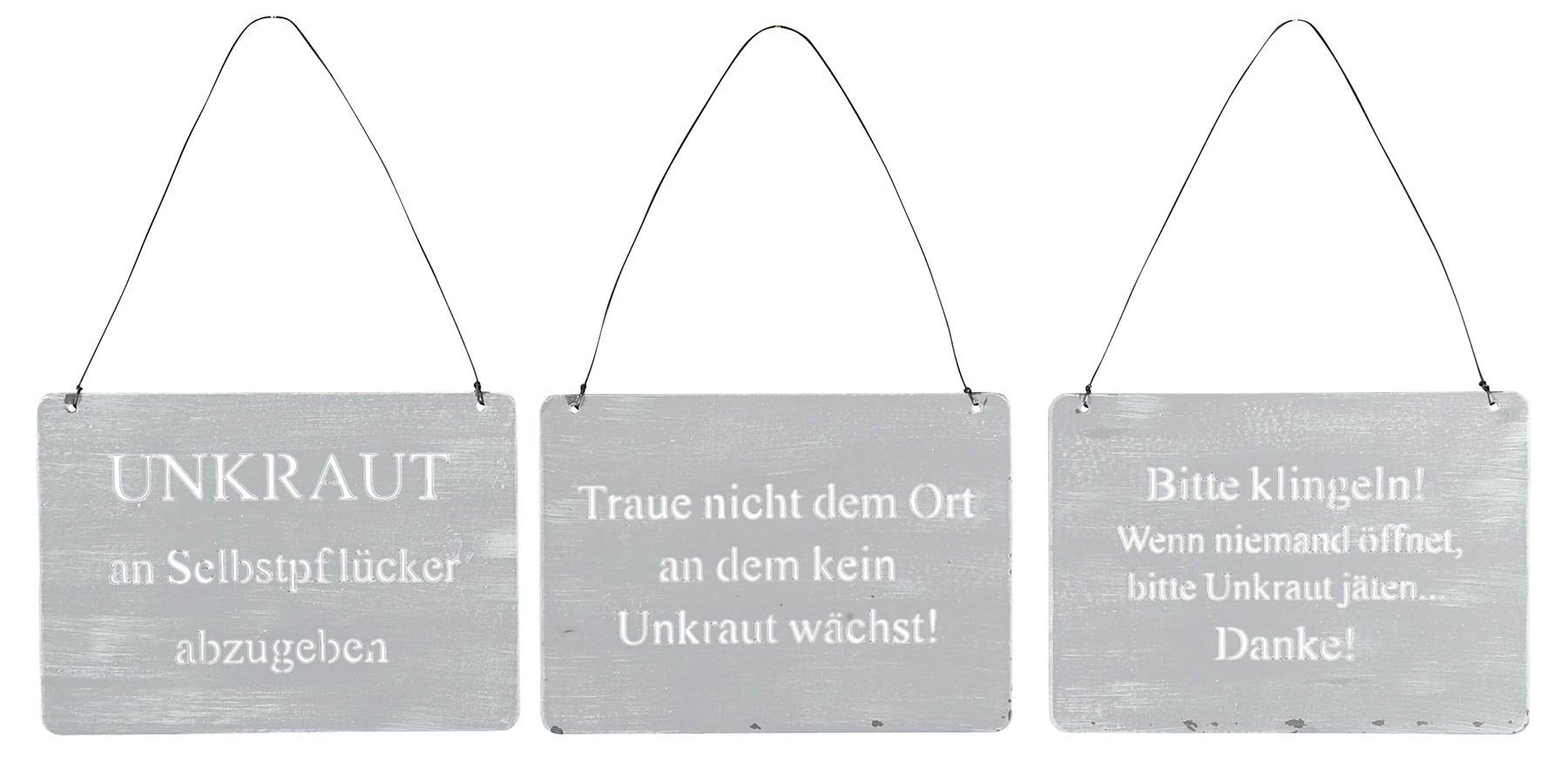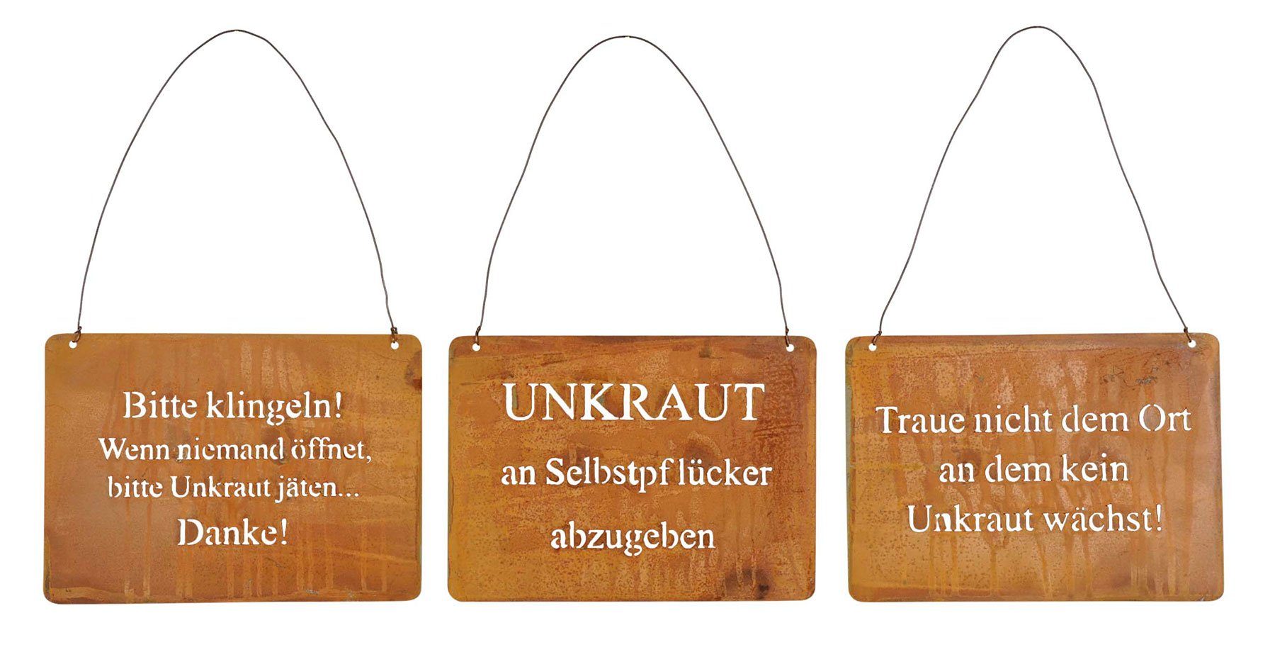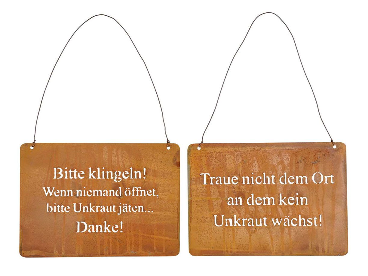 - Gesamtgröße der Rost-Deko (B/H): Jeweils 18 x 13 cm - Die Gartendekoration ist aus Eisen - Spruch 1: Traue nicht dem Ort an dem kein Unkraut wächst - Spruch 2: Bitte klingeln! Wenn niemand öffnet, bitte Unkraut jäten. Danke! - Die Farbe der Gartenschilder ist Rostoptik braun - Die Wandbilder sind mit einem Aufhänge-Draht versehen - Schilder mit ausgestanzten Sprüchen zum Aufhängen - Im Lieferumfang enthalten sind 2 verschiedene Wandschilder