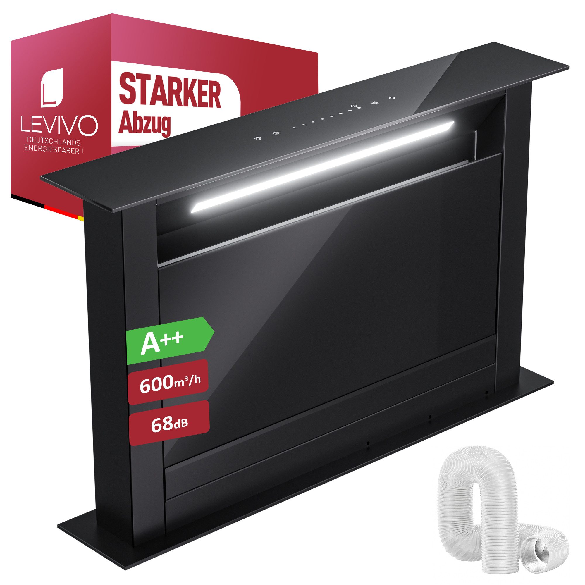 Die versenkbare LEVIVO Downdraft Dunstabzugshaube 60 cm vereint kraftvolle Leistung mit modernster Technik und einem stilvollen Design. Mit einem beeindruckenden Luftdurchsatz von bis zu 600 m³/h, 8 Leistungsstufen plus Boosterstufe, sorgt sie auch in großen Küchen für frische Luft und ein angenehmes Kochklima. Ob Abluft- oder Umluftbetrieb – die Haube passt sich flexibel Ihren Bedürfnissen an und entfernt zuverlässig Dampf, Fett und Gerüche.