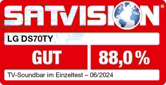 Die LG DS70TY erzielt im Einzeltest des Magazins „SATVISION“ das Gesamtergebnis „GUT (88,0 %)“. Die Soundwiedergabe ist hervorragend. Die Ausstattung überzeugt u. a. mit diversen Anschlüssen und einem externen kabellosen Aktiv-Subwoofer. Die Verarbeitung ist „sehr gut“. Außerdem ist das Gerät schnell eingerichtet und einfach zu bedienen. Insgesamt bietet die Soundbar ein „gutes“ Preis-/Leistungsverhältnis.