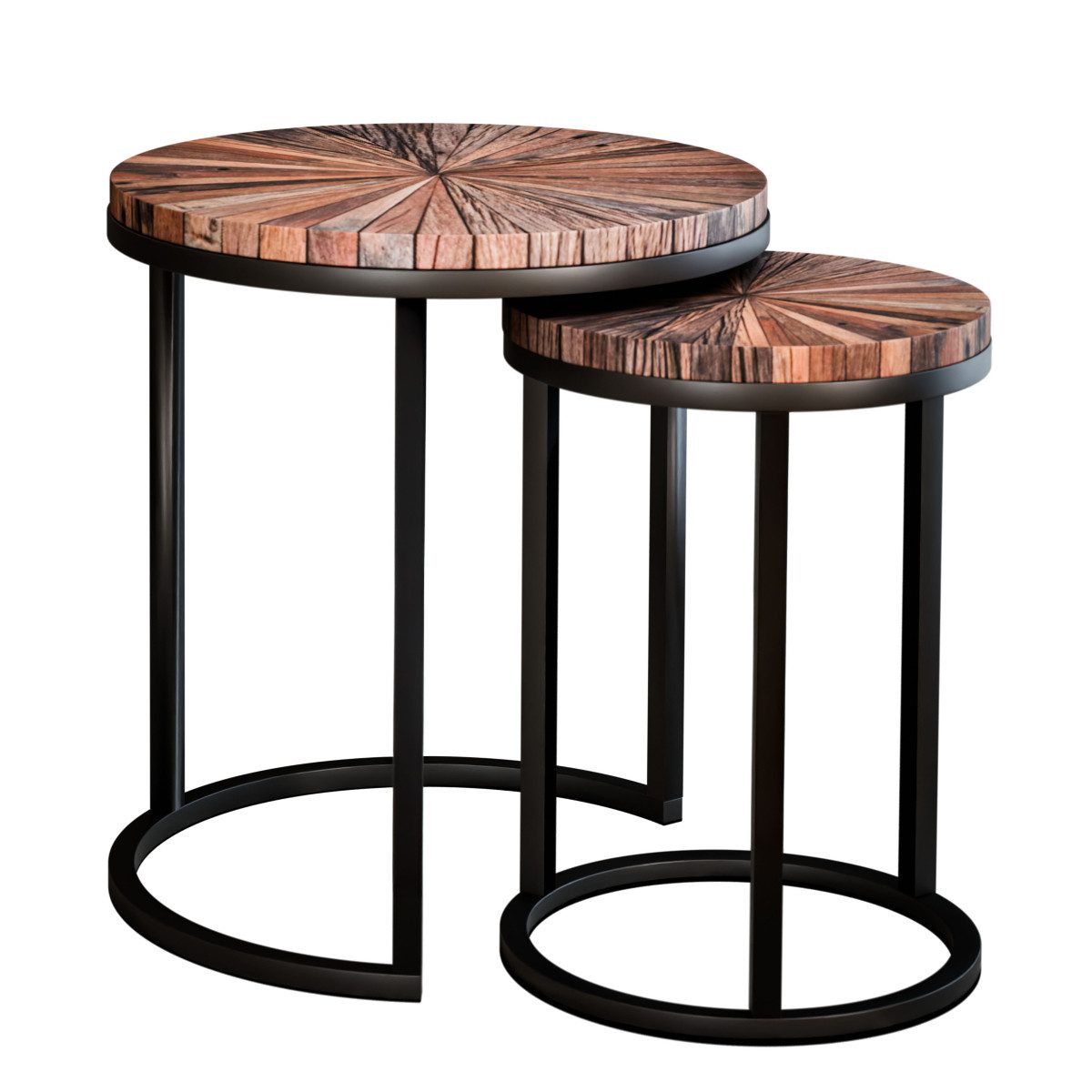 Das Girona Beistelltisch 2er Set von Liadomo vereint zeitloses Design mit natürlichem Charme. Die runden Tischplatten aus recyceltem Altholz und das schwarze Metallgestell bilden ein harmonisches Ensemble im Industrial-Stil – vielseitig einsetzbar in jedem Wohnbereich.