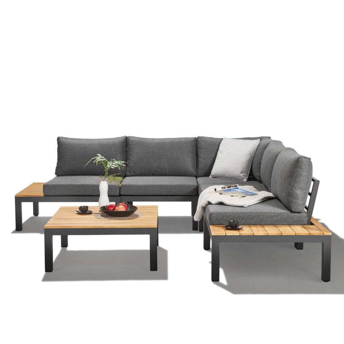 Lieferumfang | 1 (ein) Stück Endteil links mit Teak-Ablage 1 (ein) Stück Endteil rechts mit Teak-Ablage 2 (zwei) Stück Mittelteil 1 (ein) Stück Eckteil 1 (ein) Stück Loungetisch |