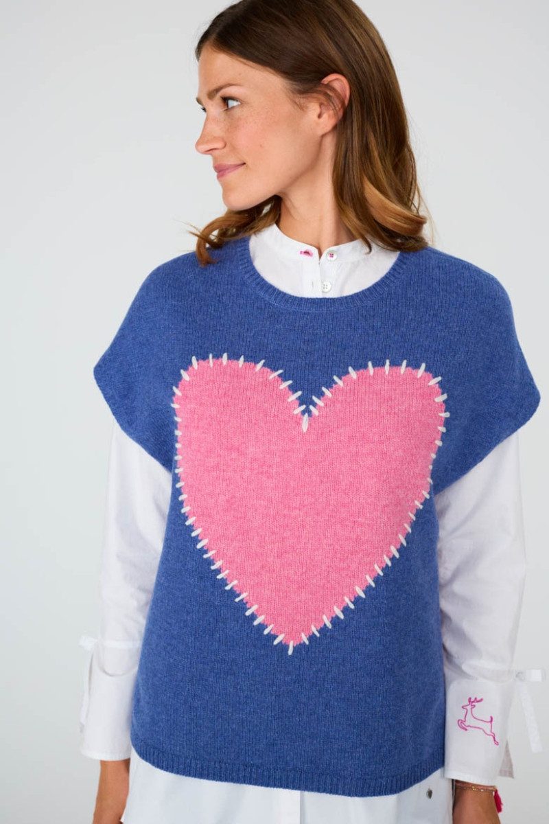 Zira, der traumhaft flauschige Damen Pullunder in der Farbe Jeans von der Marke Lieblingsstück, wird aus feiner, kuscheliger Merinowolle in Rechtsstrick gefertigt, hat einen trendy Oversize-Schnitt mit überschnittener Schulter und einen weiten Rundhals-Ausschnitt. Sowohl der Ausschnitt als auch der Saum sind in Rippenstrick-Art gearbeitet und die Armausschnitte verstärkt. Der Eyecatcher des wundervoll weichen Pullunders für Damen ist das schöne, große, gestrickte Herz-Motiv in Kontrastfarbe mit der stylisch gestrichelten Kontur auf der Vorderseite. Auch die Seitennähte sind quer-gestrichelt in Kontrastfarbe hervorgehoben und unten geschlitzt. Den Nackenbereich ziert eine kleine, kontrastfarbene Marken-Stickerei. Der Damenpullunder lässt sich fesch mit Trachtenbluse oder Longsleeve zu Lederhose und Trachtenjeans kombinieren.