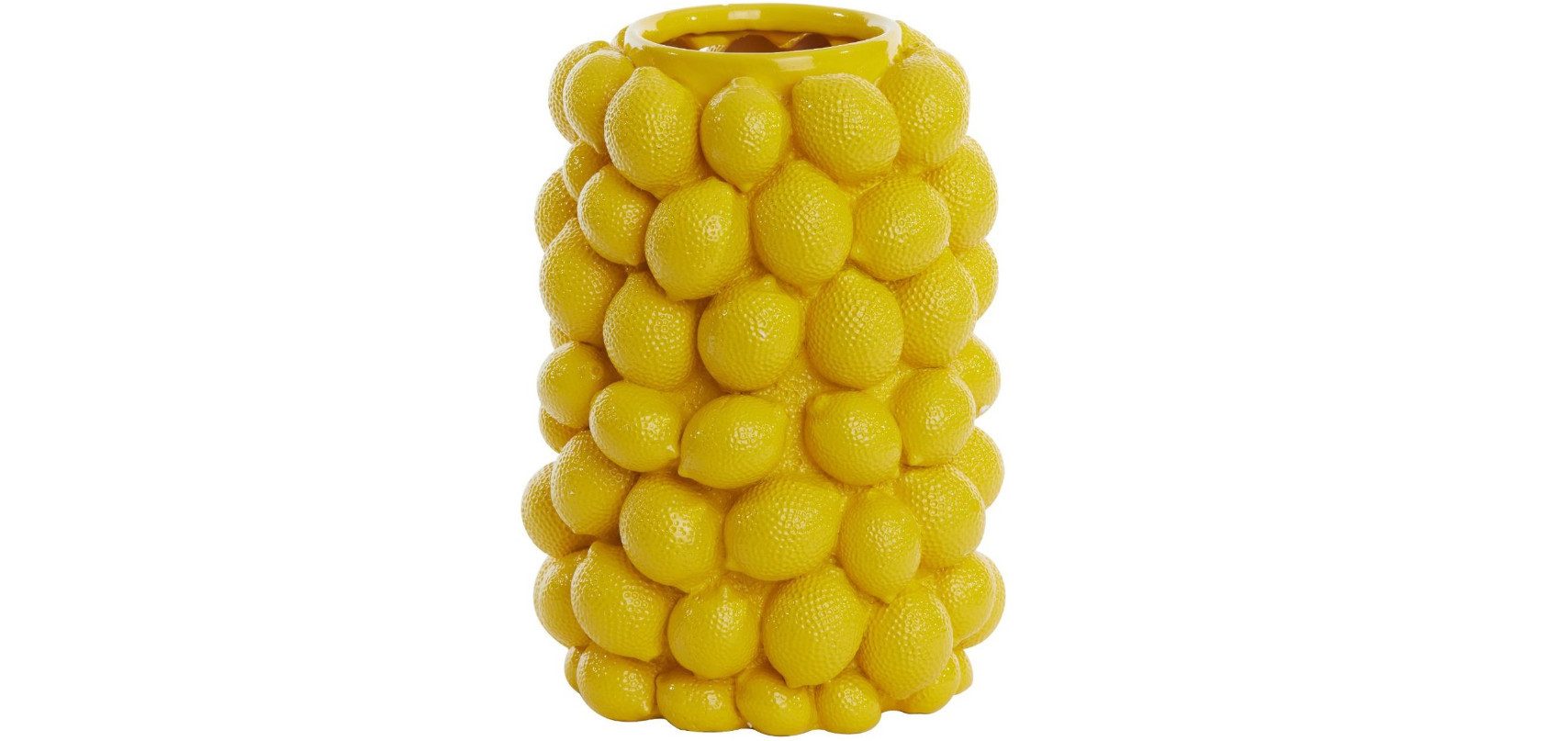 Die gelbe Zitronenvase ist perfekt für eine hippe, moderne und fruchtige Einrichtung. Nicht nur die Farbe, sondern auch die Zitronen rund um die Vase sind ein echter Blickfang. Wählen Sie eine farbenfrohe Füllung aus mehreren Kunstblumen oder einen schönen Trockenstrauß. Stellen Sie die Vase in der Nähe der Küche oder in der Sitzecke auf. Eine fröhliche Ergänzung für Ihr Interieur mit wechselnden Füllungen, ideal! Die Vase ist aus Kunststoff gefertigt und hat die Maße Ø23,5×33 cm. Stellen Sie die Vase auf den Couchtisch oder den Esstisch für ein überraschendes Element Diese Vase eignet sich perfekt zum Ausstellen von Blumen und Zweigen Leicht mit einem feuchten Tuch abwischbar. Dieses Produkt ist von der Marke Light & Living. Light & Living ist eine führende Marke im Bereich Beleuchtung, Wohnaccessoires und Kleinmöbel. Diese niederländische Marke garantiert eine schnell wechselnde und breite Kollektion mit den neuesten Trends und den richtigen Farben zu einem guten Preis-Leistungs-Verhältnis. Vase in knallgelb mit einer Höhe von 33 cm mit Zitronen aus Polyresin verziert