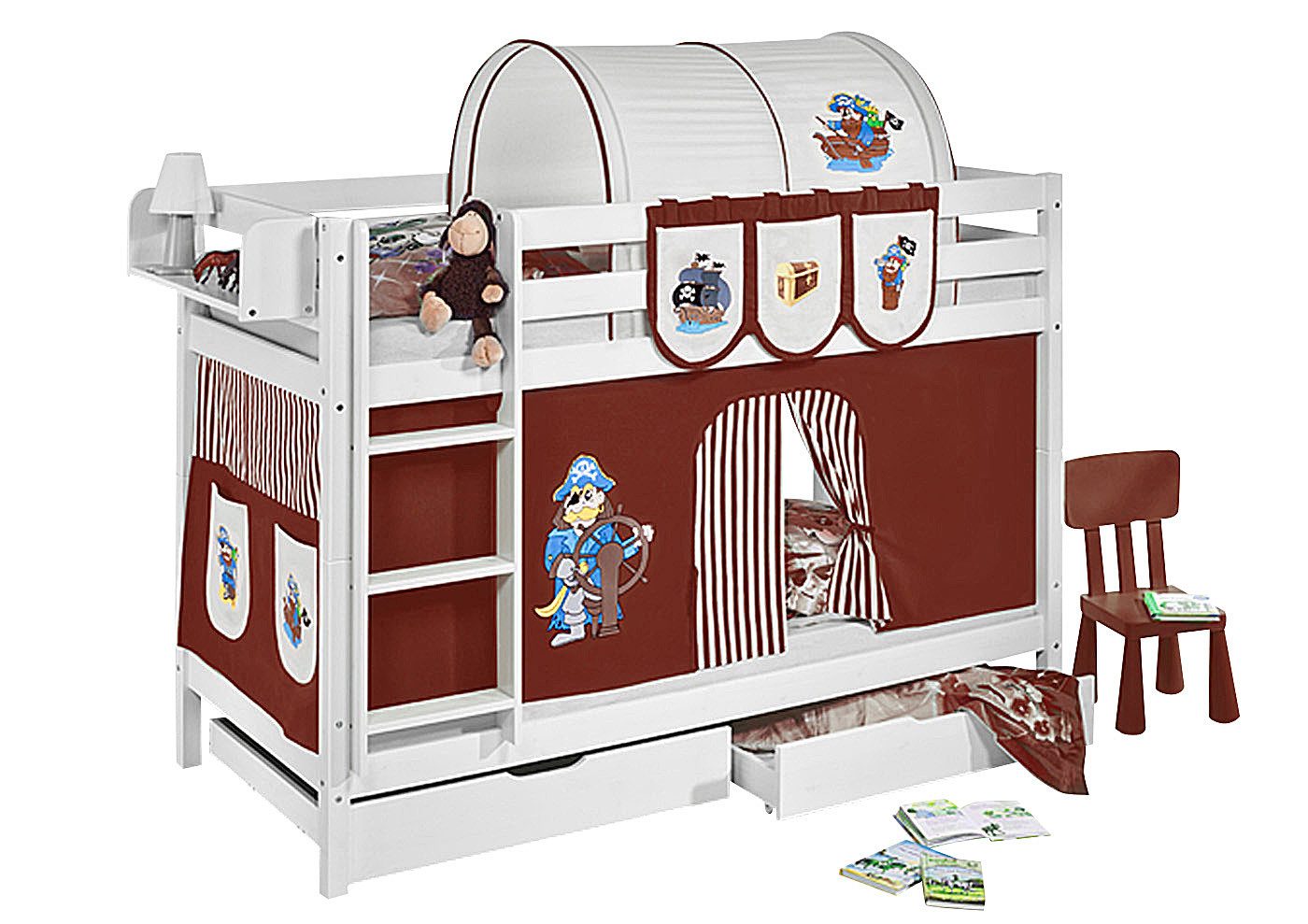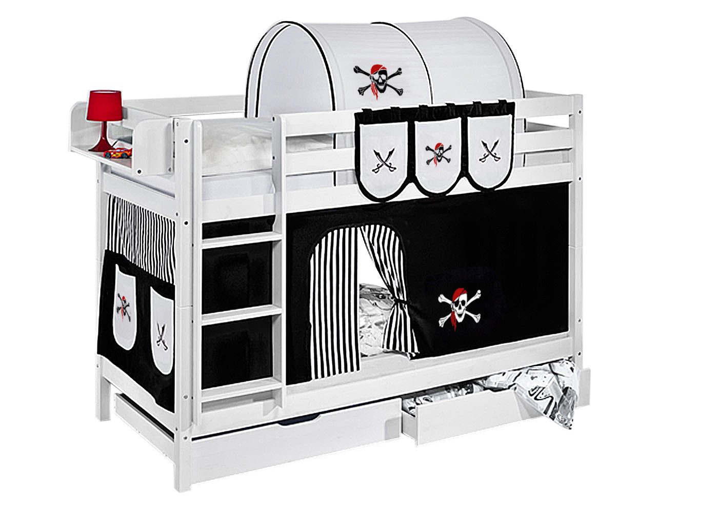 Das zeitlose Etagenbett JELLE der Marke LILOKIDS bietet zwei gemütliche Schlafplätze auf kleiner Fläche und ist die ideale Lösung für Geschwister oder Übernachtungsgäste. Mit seinen klaren Linien, der stabilen Bauweise und dem spielerischen Design ist JELLE nicht nur funktional, sondern auch ein echtes Highlight in jedem Kinderzimmer. Dank der kindgerechten Höhe, der sicheren Leiter sowie der umlaufenden Absturzsicherung schlafen und spielen Kinder hier besonders sicher. Die Pfostenstärke von 5,4 x 5,4 cm sorgt für zusätzliche Stabilität und Langlebigkeit. Sowohl die Leiter als auch der obere Schlafbereich sind so gestaltet, dass sie den hohen Anforderungen an Sicherheit und Komfort gerecht werden – gemäß den geltenden Normen EN 747:2015 für Etagen- und Hochbetten. Ein besonderer Hingucker sind die liebevoll gestalteten Textilien, die das Bett in eine fantastische Spielwelt verwandeln. So wird JELLE tagsüber zur Abenteuerzone und nachts zur Kuschelhöhle. Bitte beachten Sie: Im Lieferumfang enthalten sind das Etagenbettgestell, Lattenroste und die passenden Vorhänge. Zubehör wie Tunnel, Taschen, Hängeregal, Matratzen und Dekoration sind nicht enthalten, können aber bequem in unserem Shop dazu bestellt werden. LILOKIDS – Für kleine Träumer und große Abenteuer!