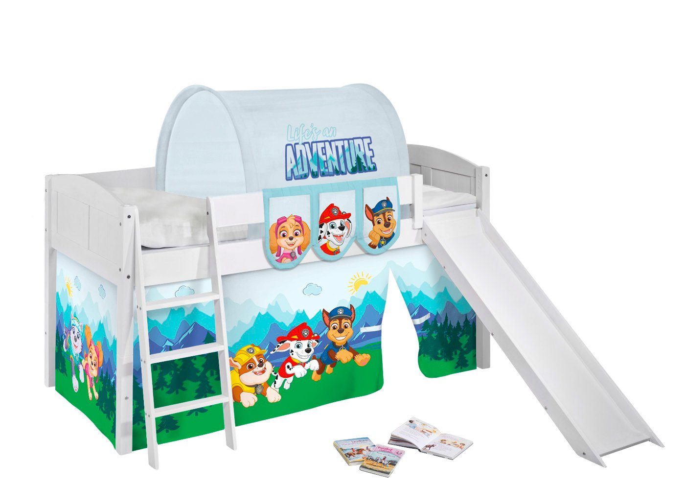 Lilokids Hochbett zum Spielen, Schlafen und Träumen. Dieses halbhohe, zeitlose Kinderbett IDA mit Rutsche der Marke LILOKIDS ist der Liebling aller Kinder und Eltern. Für das Systembett können separate Umbausets erworben werden, um aus dem Halbhochbett ein Hochbett, ein Jugendbett oder ein L-Etagenbett zu machen. Durch den Vorhang von "PAW PATROL" lädt unser Spielbett IDA nicht nur zum Träumen, sondern auch zum Spielen ein und weckt die Fantasie Ihres Kindes. Die Leiter und die Rutsche können beidseitig montiert werden, damit das Bett perfekt in jedes Kinderzimmer gestellt werden kann. Die breiten Trittstufen mit der leicht schrägen Leiter sorgen für einen angenehmen und sicheren Aufstieg. Die Rutsche und der Vorhang sind inklusive. Bitte beachten Sie, dass unsere weiteren Accessoires wie Tunnel, Taschen, Hängeregal, Lattenrost, Matratze und Dekoration nicht im Lieferumfang enthalten sind. Dieses Zubehör können Sie separat hinzubestellen. Bei Kindermöbeln sollten Sie besonders auf die Sicherheit Ihres Kindes achten. Die Absturzsicherung sowie die Pfostenstärke von 54x54 machen IDA zu einer kindersicheren Sache. Wir gewähren für alle LILOKIDS-Betten eine robuste Konstruktion und gute Verarbeitung gemäß den Normen EN 747:2015 für Kinderhoch- und Etagenbetten. Produktdetails: Material: Massivholz Kiefer Farbe: weiß lackiert Liegefläche: 90 x 200 cm Außenmaß (HxBxL): ca. 113 x 210 x 208 cm Pfostenstärke: 5,4 x 5,4 cm Nischenhöhe: ca. 71 cm Vorhang aus 100% Polyester (bei 30°C waschbar) rundum Absturzsicherung und Leiter
