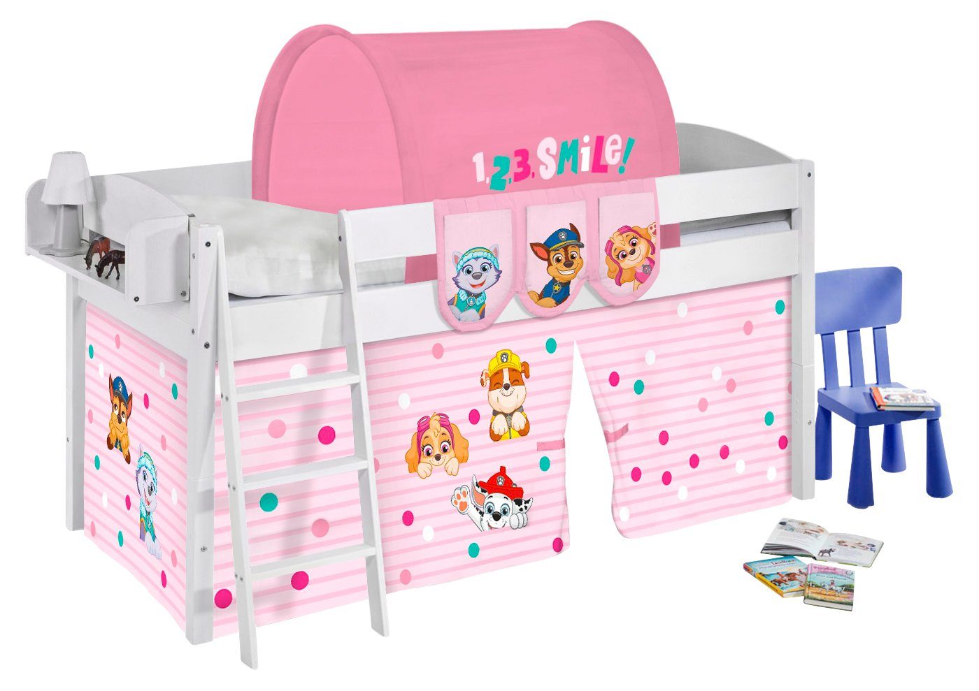 Lilokids Hochbett zum Spielen, Schlafen und Träumen. Dieses halbhohe, zeitlose Kinderbett IDA der Marke LILOKIDS ist der Liebling aller Kinder und Eltern. Für das Systembett können separate Umbausets erworben werden, um aus dem Halbhochbett ein Hochbett, ein Jugendbett oder ein L-Etagenbett zu machen. Durch den Vorhang von "PAW PATROL" lädt unser Spielbett IDA nicht nur zum Träumen, sondern auch zum Spielen ein und weckt die Fantasie Ihres Kindes. Die Leiter kann sowohl links als auch rechts montiert werden, damit das Bett perfekt in jedes Kinderzimmer gestellt werden kann. Die breiten Trittstufen mit der leicht schrägen Leiter sorgen für einen angenehmen und sicheren Aufstieg. Der Vorhang ist inklusive. Bitte beachten Sie, dass unsere weiteren Accessoires wie Tunnel, Taschen, Hängeregal, Lattenrost, Matratze und Dekoration nicht im Lieferumfang enthalten sind. Dieses Zubehör können Sie separat hinzubestellen. Bei Kindermöbeln sollten Sie besonders auf die Sicherheit Ihres Kindes achten. Die Absturzsicherung sowie die Pfostenstärke von 54x54 machen IDA zu einer kindersicheren Sache. Wir gewähren für alle LILOKIDS-Betten eine robuste Konstruktion und gute Verarbeitung gemäß den Normen EN 747:2015 für Kinderhoch- und Etagenbetten. Produktdetails: Material: Massivholz Kiefer Farbe: weiß lackiert Liegefläche: 90 x 200 cm Außenmaß (HxBxL): ca. 113 x 98 x 208 cm Pfostenstärke: 5,4 x 5,4 cm Nischenhöhe: ca. 71 cm Vorhang aus 100% Polyester (bei 30°C waschbar) rundum Absturzsicherung und Leiter