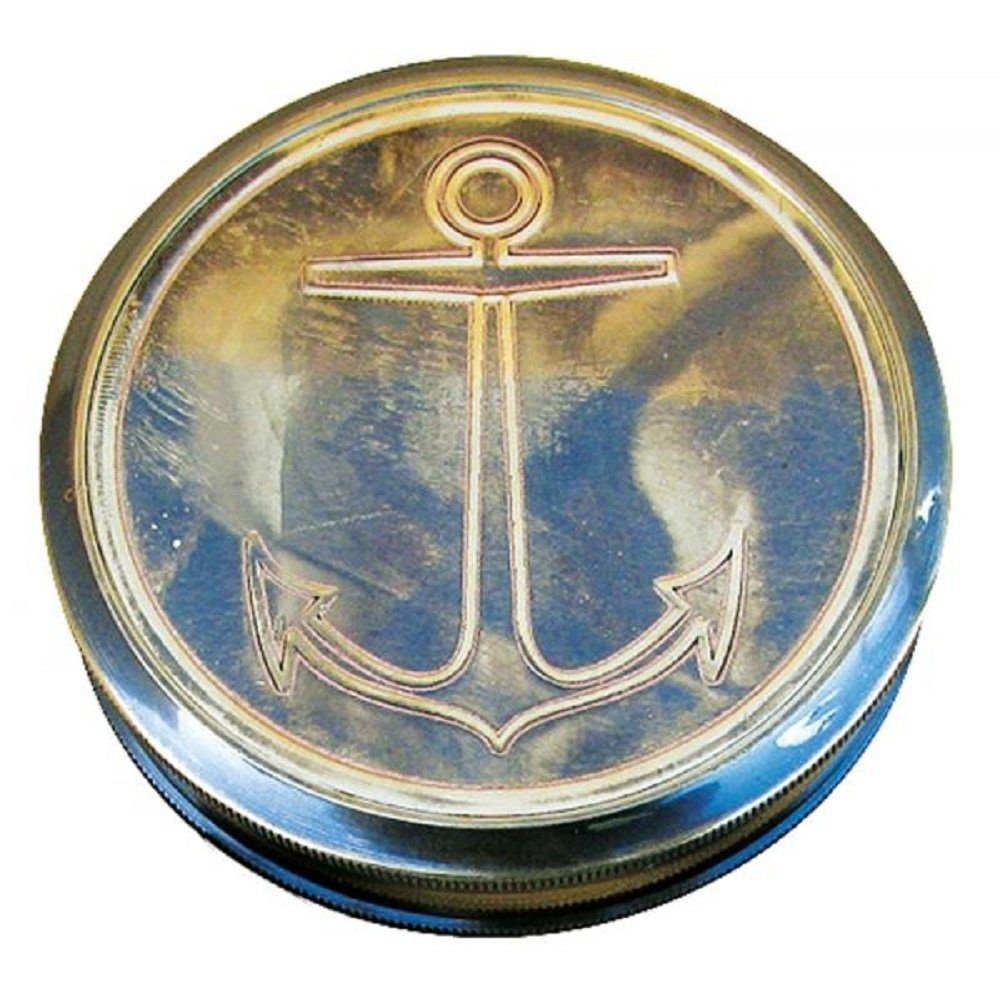 Maritimer Dosenkompass, Kompass und Dauerkalender in verschließbarer Dose aus Altmessing. Der Kompass ist auf dem Deckel mit einem Anker graviert. Der Kompass hat ein goldenes Ziffernblatt mit arabischen Zahlen. Unsere maritimen Messinstrumente sind Repliken historischer Vorbilder und dienen vorwiegend dekorativen oder Sammlerzwecken. Dabei wurde besonderen Wert auf die Qualität und die historische Genauigkeit der Objekte, unter Verwendung hochwertiger Materialien gelegt.