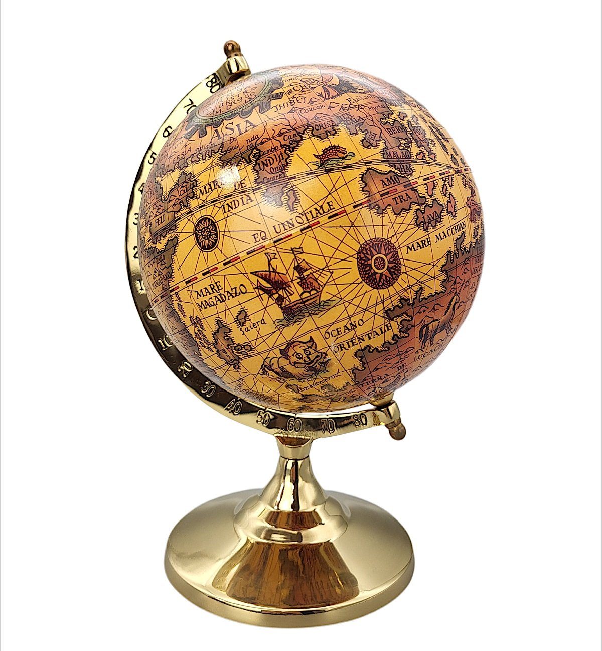 Reiche Kaufleute und Kapitänsfamilien hatten den Wunsch, die Routen der Seefahrer nachzuverfolgen. Die Niederlande wurde im 16. Jahrhundert zum Herstellungszentrum für immer bessere geografische Karten, Globen und Navigationsinstrumente. Hier erhalten Sie ein Modell eines solchen dekorativen und ausgesprochen schönen Globus, aus dem Zeitalter der großen Entdeckungen. Der Ständer ist aus massivem anlaufgeschütztem Messing gefertigt.