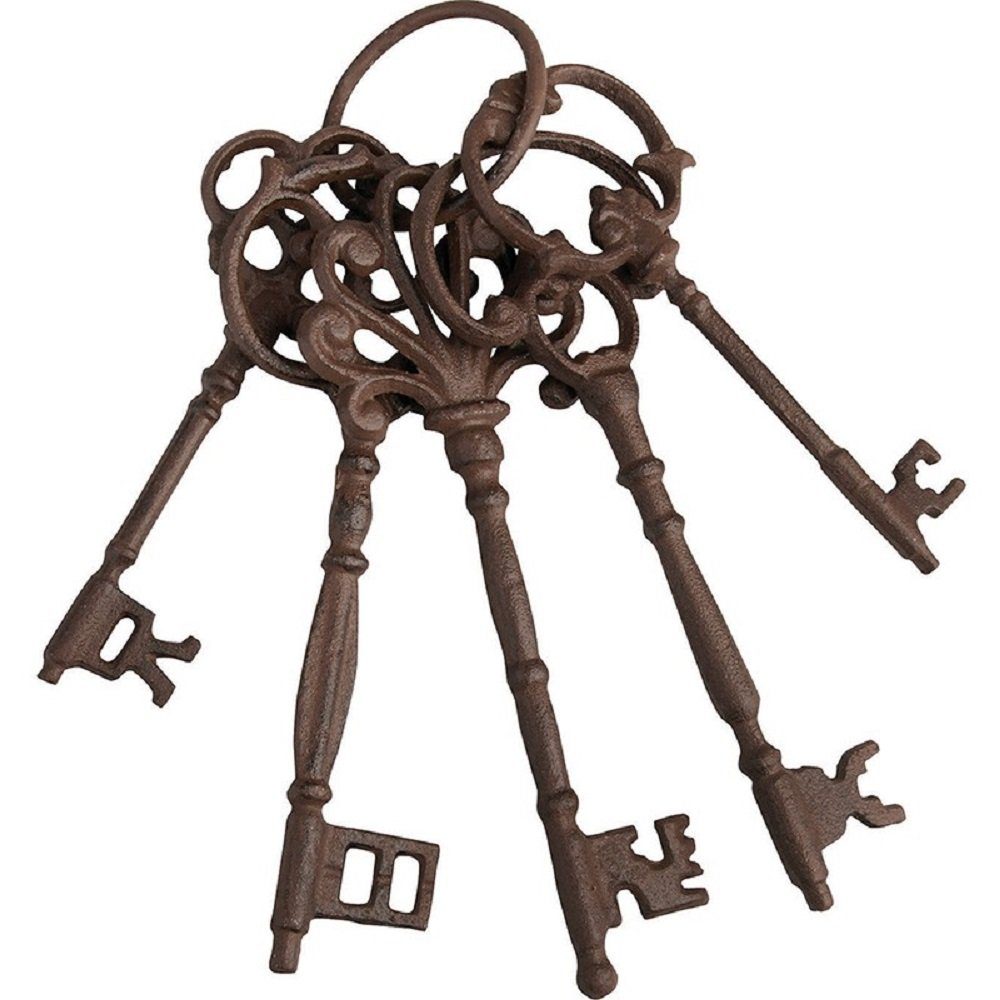 Antik Schlüsselbund, 5 große Mittelalter Schlüssel am Ring aus braunem Gusseisen. Ein Hingucker an jedem Ort und ein tolles Geschenk für die Wohnungseinweihung, einen Umzug oder einfach als Gartendekoration.