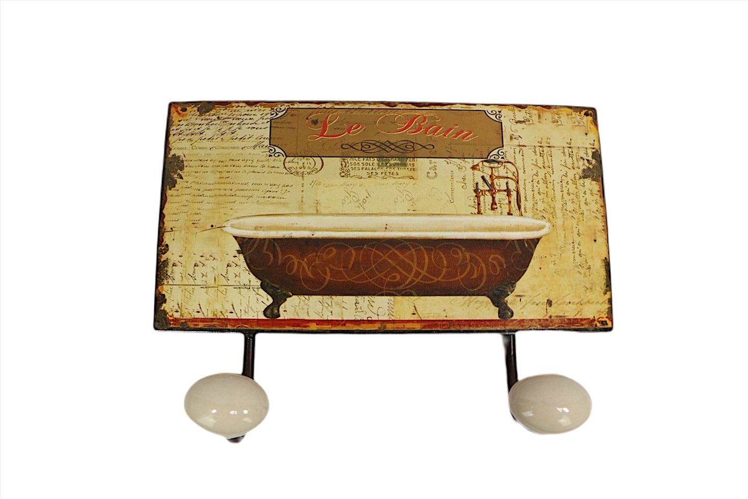 Hakenleiste "Le Bain", Wandhaken, Wandhakenleiste, Badezimmer Handtuchhaken mit farbigem Rückenschild. Auf dem Schild ist eine antike Badewanne im romantischem Landhausstil dargestellt. Der Handtuchhalter ist aus Metall, die Hakenenden sind aus Keramik gefertigt. Der Haken ist mit zwei Bohrungen versehen und sieht alt und rustikal aus, Befestigungsmaterial wird nicht mitgeliefert. Mögliche eingearbeitete Gebrauchsspuren sorgen für den rustikalen Charme unserer Produkte und sollen deren nostalgisches Aussehen unterstreichen.