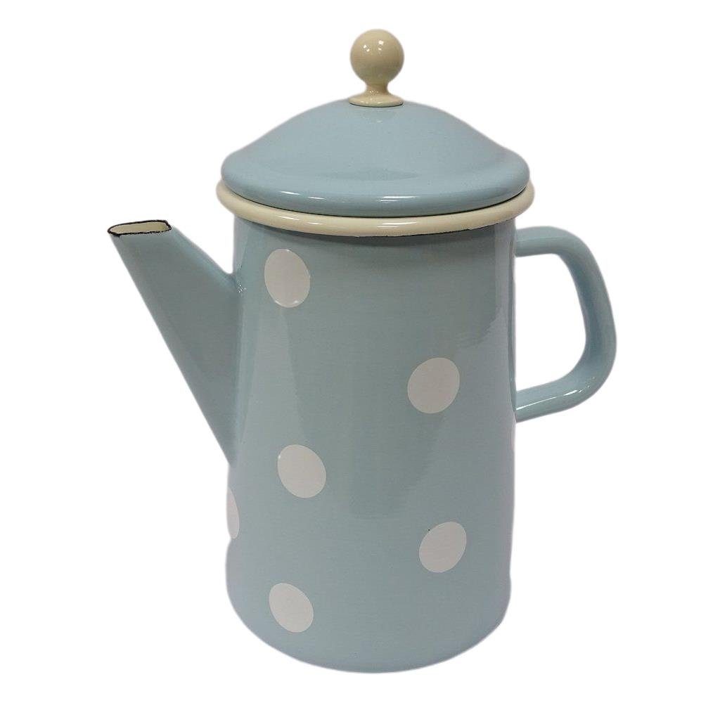 Emaille Kaffeekanne, Deckelkanne, Henkelkanne, Dekor Hellblau mit weißen Tupfen 1,6 Liter. Diesen Artikel haben wir in unterschiedlichen Dekoren. Besuchen Sie unsere Angebote und suchen Sie nach dem Stichwort "Emaille", dort finden Sie hunderte Artikel aus Emaille. Das produzieren von Gegenständen aus Emaille erfordert zu einem großen Teil reine handwerklicher Arbeit. Daher gleicht kein Produkt einer Serie dem anderen. Kleine Risse, Schrunden und Unebenheiten in den Oberfläche sind Folge des aufwendigen Produktionsprozesses und stellen keinen Qualitätsmangel dar.