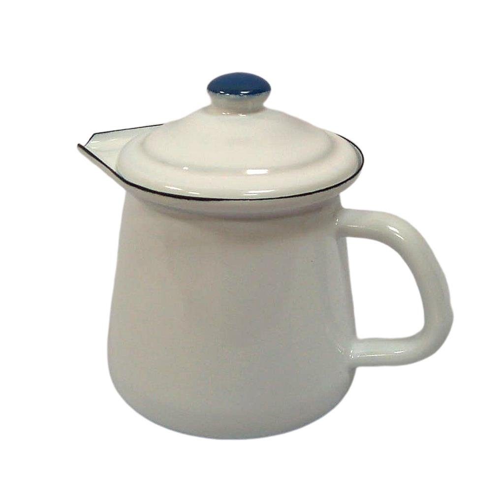 Sahnekännchen mit Deckel, Emaille Milch Kännchen, Dekor Weiß mit blauem Rand, 0,4 Liter. Diesen Artikel haben wir in unterschiedlichen Dekoren mit und ohne Deckel. Besuchen Sie unsere Angebote und suchen Sie nach dem Stichwort "Emaille", dort finden Sie hunderte Artikel aus Emaille. Das produzieren von Gegenständen aus Emaille erfordert zu einem großen Teil reine handwerklicher Arbeit. Daher gleicht kein Produkt einer Serie dem anderen. Kleine Risse, Schrunden und Unebenheiten in den Oberfläche sind Folge des aufwendigen Produktionsprozesses und stellen keinen Qualitätsmangel dar.