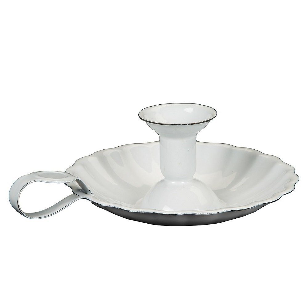 Emaille Kerzenleuchter, Nostalgie Nachtleuchter in Muschelform mit Fingeröse Weiß- Schwarz. Leuchter in dekorativer Ausführung im Landhaus Stil. Der Leuchter mit seiner antiquarischen Erscheinung ist aus antik weißem emailliertem Stahlblech. Mit den gewünschten Gebrauchsspuren wird der Leuchter zu einem Hingucker wie aus Omas Zeiten. Kleine Risse, Schrunden und Unebenheiten in den Oberfläche gehören zu dieser Landhausserie und sind bewusst gewollt und stellen keinen Qualitätsmangel dar. Wir führen ein sehr umfangreiches Меню an Emaillewaren.