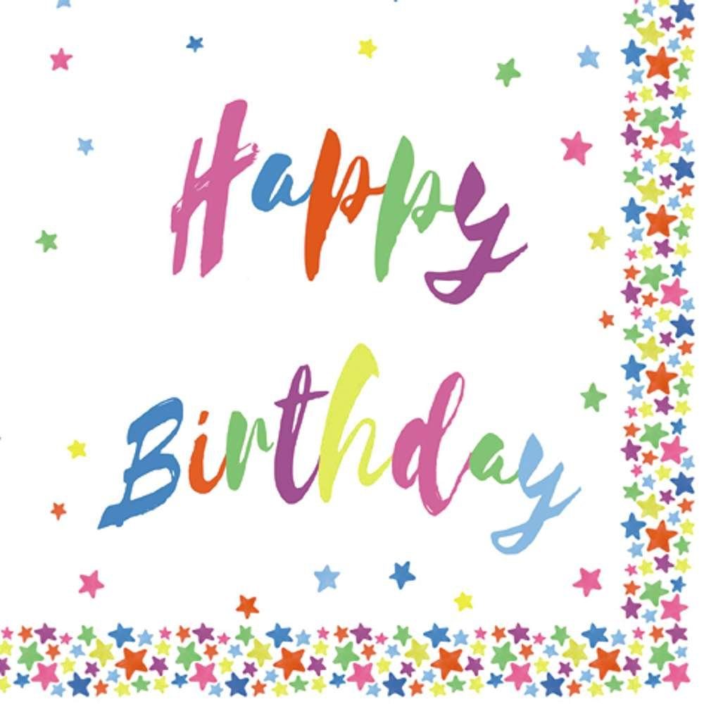 20 Servietten Kinderfeier, Всеs Gute zum Geburtstag, Happy Birthday und Sterne, Schulutensilien, 20 Papierservietten aus Tissue-Papier 33 x 33 cm.