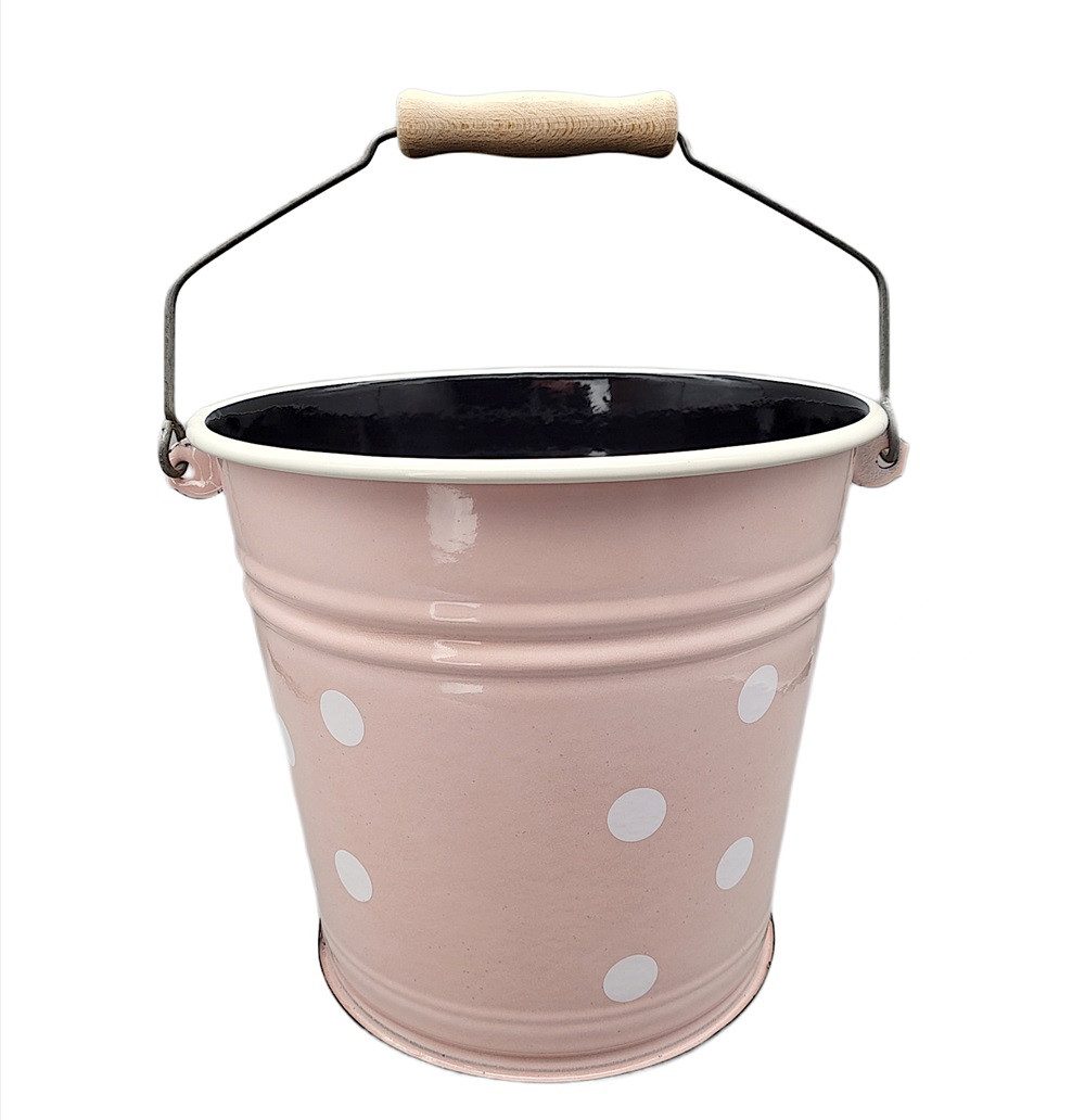 Emaille Eimer, Nostalgie Wassereimer, Rosa mit Tupfen 6 Liter. Der Tragegriff ist mit einer ergonomisch gedrechselten Holzrolle ummantelt. Diesen Eimer haben wir in verschiedenen Dekoren. Wir führen Hunderte rustikale Emaille Artikel. Besuchen Sie unseren Shop und gehen dann auf die Rubrik Emaille. Das produzieren von Gegenständen aus Emaille erfordert zu einem großen Teil reine handwerklicher Arbeit. Daher gleicht kein Produkt einer Serie dem anderen. Kleine Risse, Schrunden und Unebenheiten in den Oberfläche sind Folge des aufwendigen Produktionsprozesses und stellen keinen Qualitätsmangel dar.